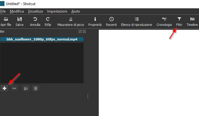 Per aggiungere un filtro seleziona lo spezzone da modificare e clicca in alto su Filtri, poi clicca sul tasto a forma di + che vedrai comparire nella sezione.
