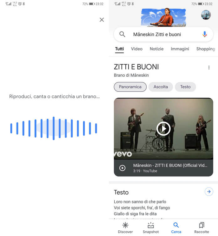 Avvicina il microfono al dispositivo che sta riproducendo la canzone, in alternativa puoi anche cantare o canticchiare la canzone, attendi qualche secondo, e Google ti restituirà il nome della canzone e tantissime altre informazioni.