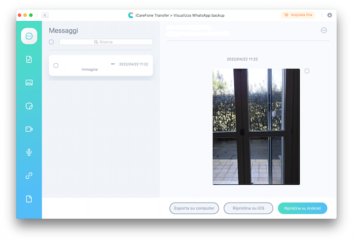 - Da questa schermata puoi scegliere se esportare il backup di WhatsApp sul Mac oppure ripristinarlo su iPhone o su Android. La versione gratuita di iCareFone Transfer consente soltanto di visualizzare il backup appena eseguito: invece, se vuoi esportare il backup delle chat di WhatsApp direttamente sul Mac e ripristinare i dati precedentemente conservati su un altro iPhone o su un telefono Android devi necessariamente acquistare la versione completa, che consente anche di trasferire il backup WhatsApp da Android a iPhone.