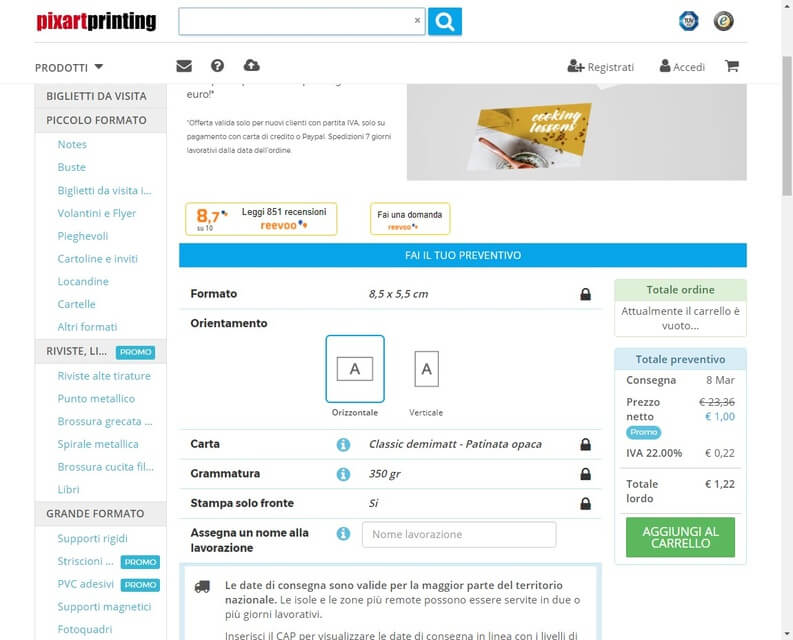 Se hai la ha partita IVA puoi sfruttare l’offerta di Pixartprinting per creare biglietti da visita online gratis (o quasi): offre 250 biglietti con tema a scelta in pronta consegna a solo 1€ (1,22€ con IVA) con spedizione gratuita, decisamente un affare da cogliere al volo! Sarà sufficiente scegliere l’orientamento, indicare i dati da aggiungere al biglietto da visita e fare clic su Aggiungi al carrello per aprire il sistema di pagamento e scegliere l’indirizzo di spedizione. Il sito offre comunque numerose proposte di biglietti da visita di vari formati e tipologie, con prezzi che diventano più convenienti in caso di richiesta di quantitativo numeroso di biglietti.