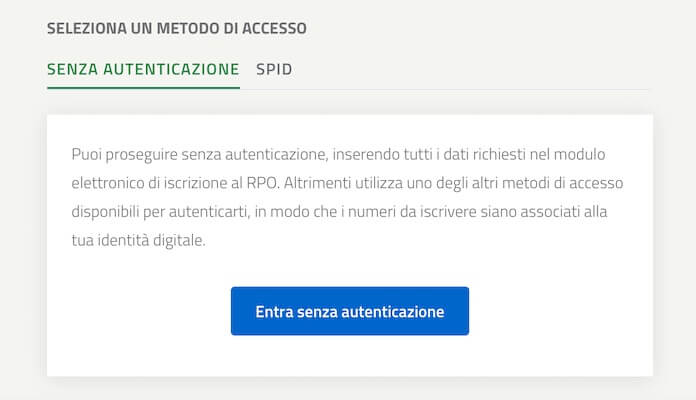 Seleziona ora il metodo di accesso. Puoi accedere tramite SPID (per richiedere lo SPID puoi seguire la nostra guida) oppure puoi accedere senza autenticazione. Se la scelta ricade su quest’ultima opzione, mantieni la selezione del tab “Senza autenticazione” e fai clic su “Entra senza autenticazione”.