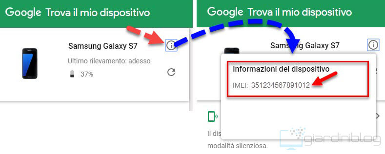 Nella schermata che appare, in alto a sinistra trovate il vostro smartphone con a lato una “i” cerchiata. Cliccandoci sopra avrete finalmente l’IMEI del vostro smartphone Android.
