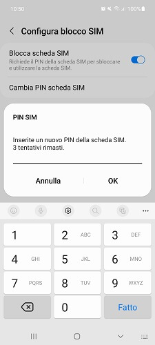 - Digita il codice PIN attuale nel campo posizionato sotto “Inserisci PIN per sbloccare la SIM. Restano 3 tentativi”, quindi premi su “Fine” in alto a destra per confermare.