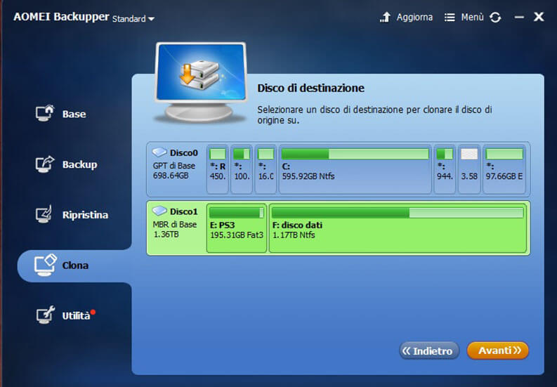 La procedura di clonazione di un hard disk con Aomei Backupper