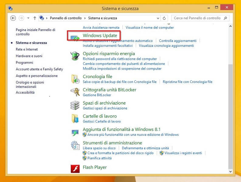 Per controllare aggiornamenti Windows 8.1 premi la combinazione di tasti “WIN+I” per richiamare il pannello “Impostazioni” e seleziona il “Pannello di controllo” > “Sistema e Sicurezza” > “Windows Update”.