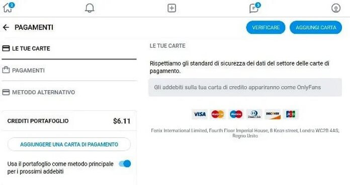 Per prima cosa bisogna aggiungere un metodo di pagamento, unico modo per accedere a tutti i servizi offerti. Prima di proseguire con la spiegazione va detto che Onlyfans supporta solo le carte di credito: non è possibile usare né PayPal né le carte prepagate.