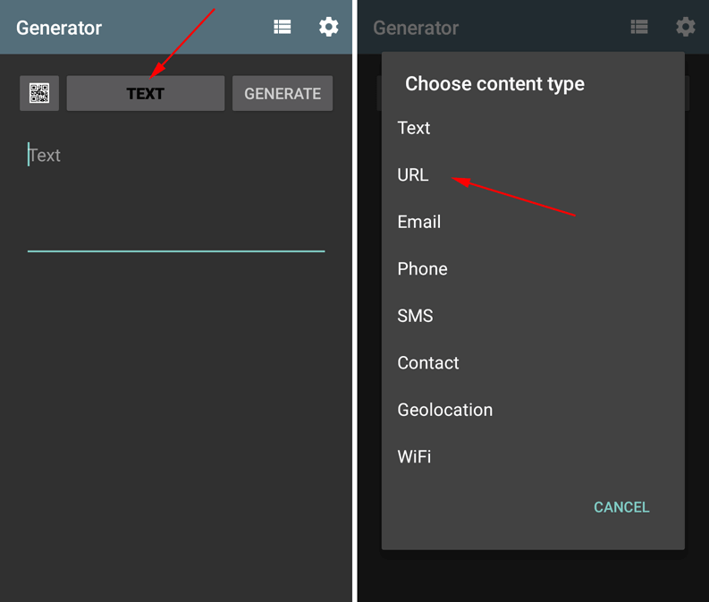 L’applicazione è molto semplice e permette di generare tantissimi tipi diversi QR Code, come potete vedere dall’immagine qui sotto a sinistra, cliccando nel campo dove c’è scritto inizialmente Text, si apriranno in un menù a tendina, tutti i tipi di QR Code che possiamo realizzare.