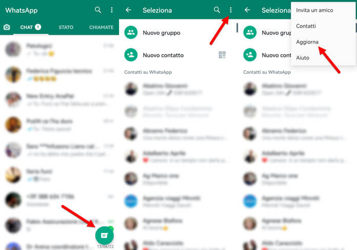 La nuova aggiunta dovrebbe comparire nell’elenco in automatico. Se così non fosse, chiudi e riapri l’app WhatsApp, pigia su “Nuova chat” (l’icona in basso a destra), premi sull’icona dei tre puntini in alto a destra e dal menu a tendina che si apre seleziona “Aggiorna”.