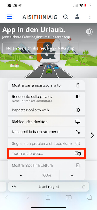 La funzionalità nativa di traduzione di Safari è integrata anche nel browser predefinito di iPhone. Prima di tutto, collegati alla pagina che intendi tradurre, dopodiché premi sul simbolo “Aa” posizionato nella barra degli indirizzi, quindi fai tap su “Traduci sito web” e seleziona la lingua “Italiano”.