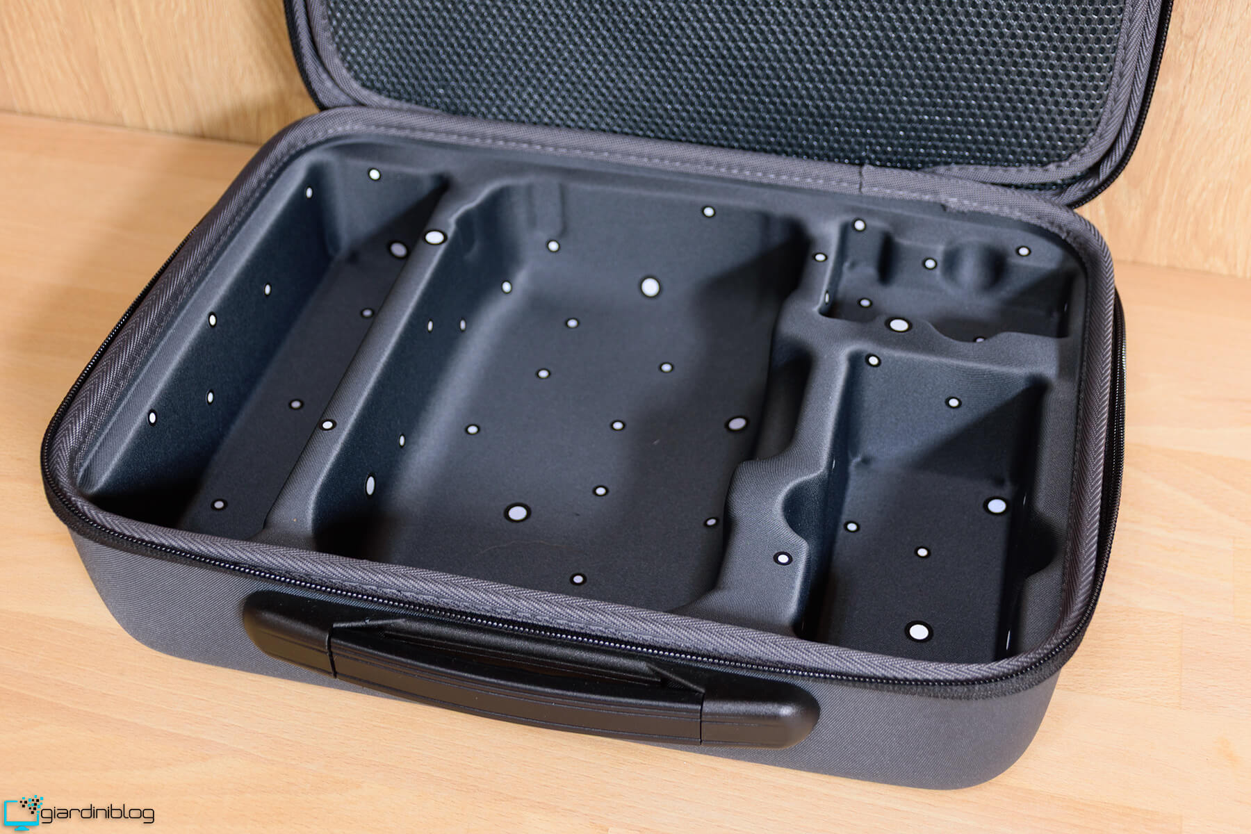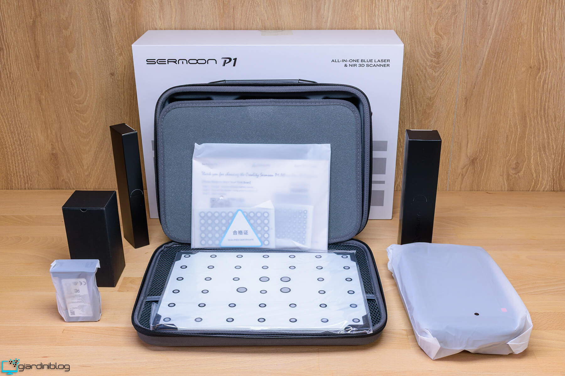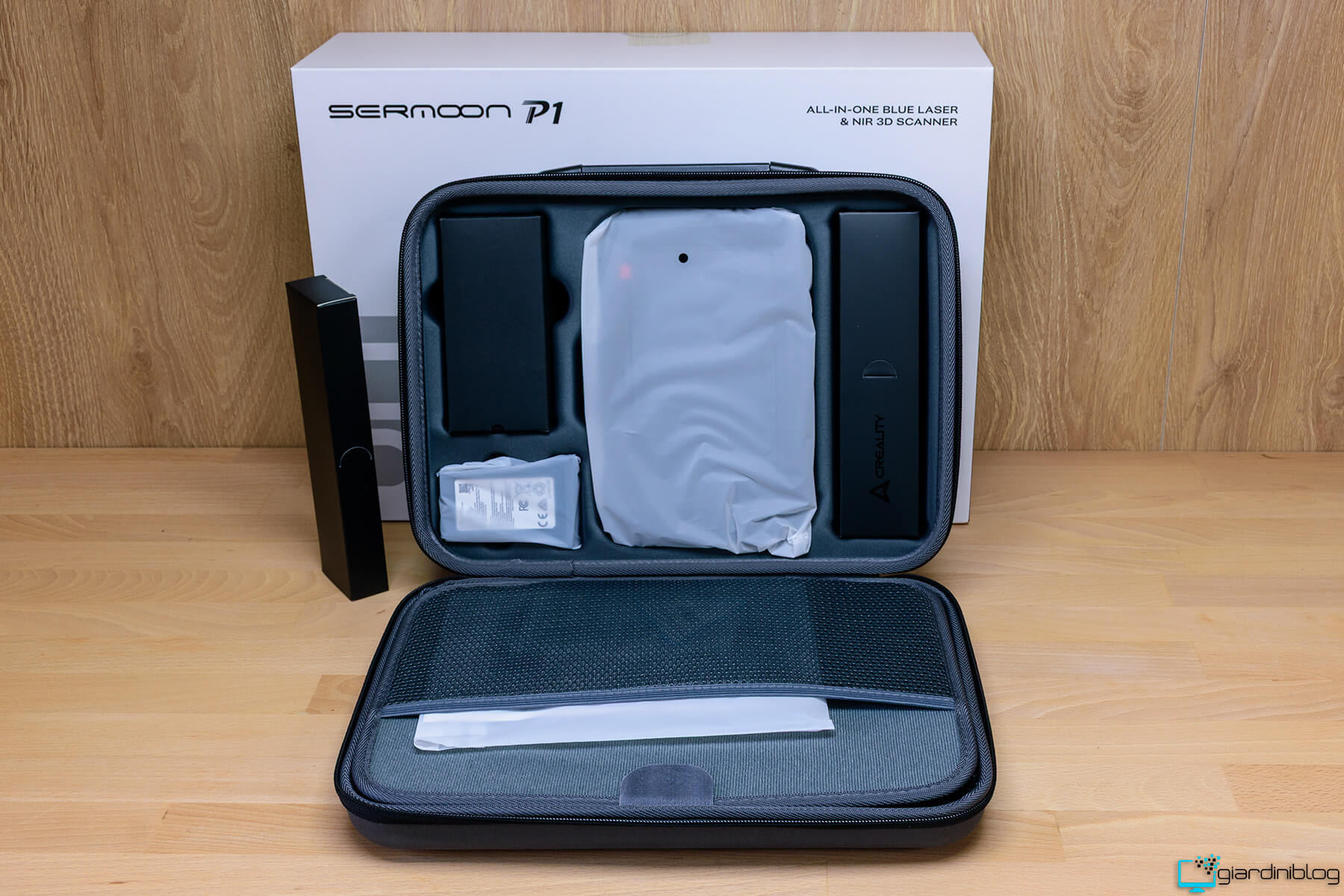 Aprendo la custodia semi-rigida del Sermoon P1, ci si trova davanti a un’organizzazione interna estremamente ordinata, dove lo scanner 3D e tutti gli accessori sono disposti in scomparti dedicati e protetti da inserti in schiuma sagomata. Ogni elemento è alloggiato con precisione, dando subito una sensazione di cura progettuale e di attenzione ai dettagli tipica delle attrezzature professionali.