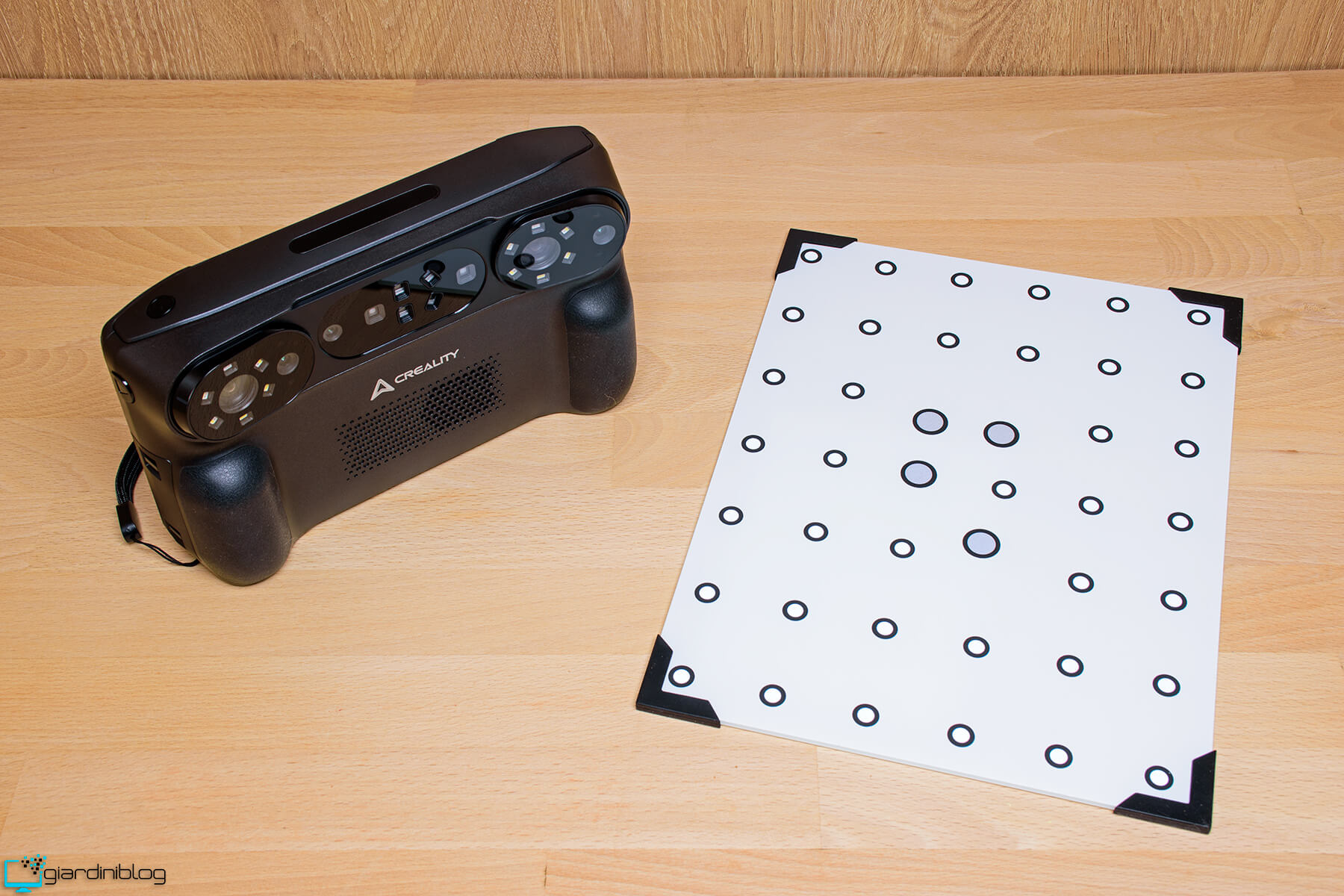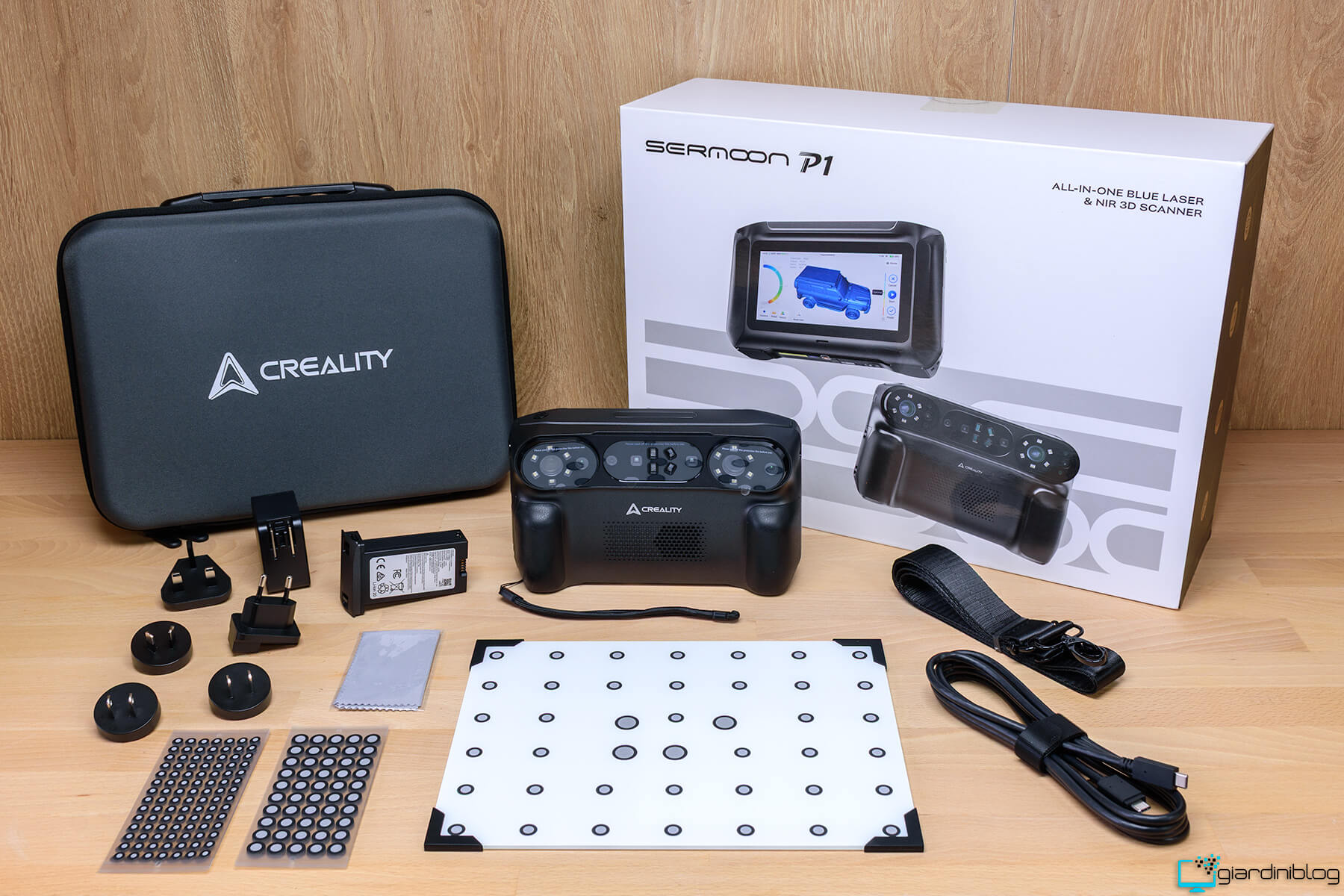 A completare il kit troviamo l’alimentatore con 5 diversi adattatori a seconda del sistema di prese elettriche utilizzato nel paese in cui ci si trova, un cavo da 2 metri Type-C/Type-C. Tra gli elementi più importanti inclusi nel kit troviamo la piastra di calibrazione in vetro ad alta precisione, un componente fondamentale per garantire l’accuratezza delle scansioni.