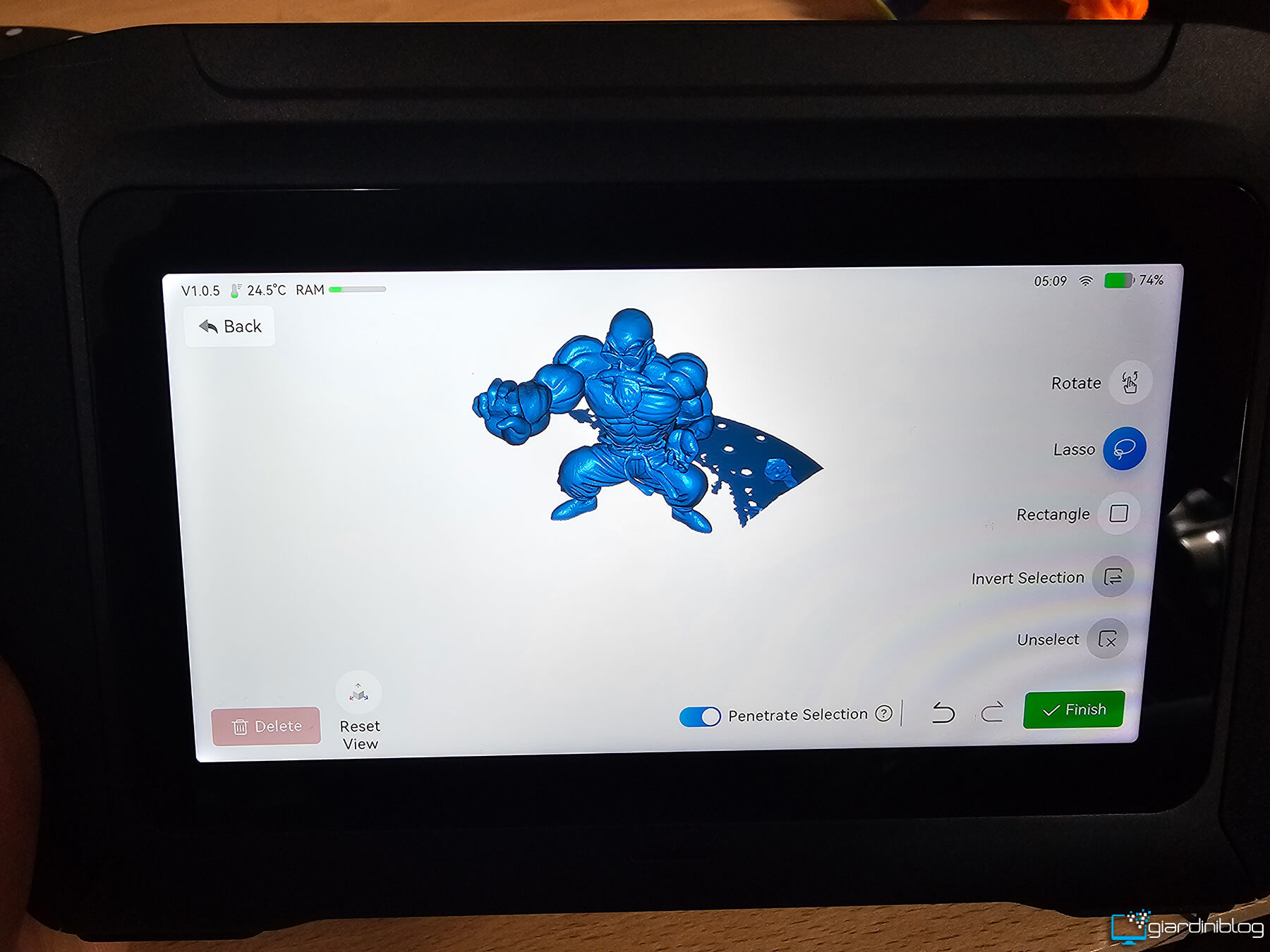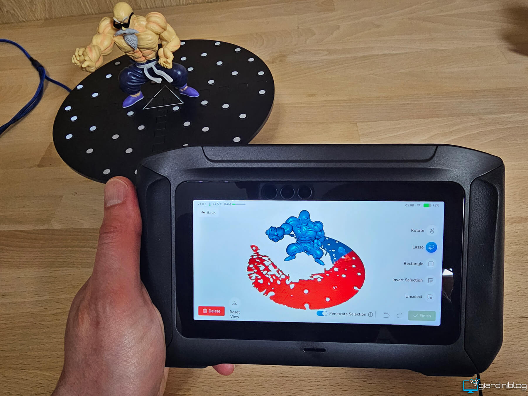 Sul retro è presente invece un display touchscreen da 6 pollici luminoso e reattivo, che costituisce il centro operativo dello scanner. Attraverso questa interfaccia è possibile gestire tutte le fasi di lavoro, dalla scansione all’elaborazione, fino all’esportazione del modello finale. L’esperienza d’uso ricorda quella di uno smartphone, con interfaccia fluida e controlli immediati.