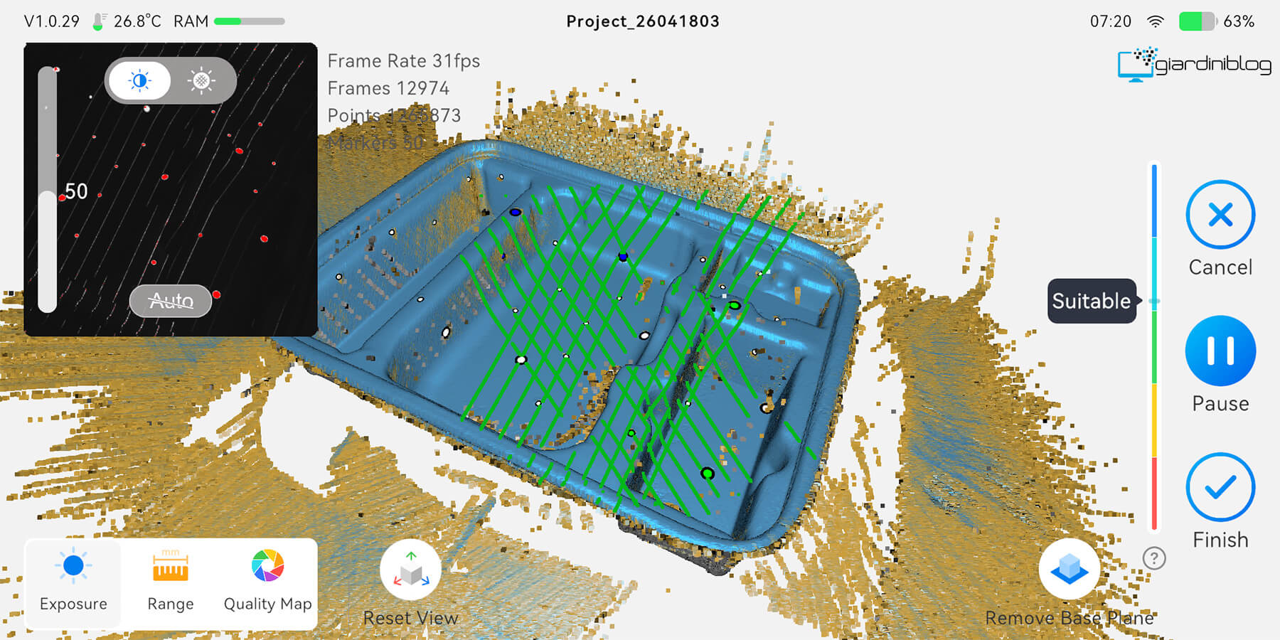 La capacità di allineare automaticamente più scansioni è particolarmente avanzata: operazioni che normalmente richiedono interventi manuali vengono completate in pochi secondi direttamente sul dispositivo. Tuttavia, in contesti più critici, ad esempio con oggetti molto grandi o cambi di angolo bruschi, il tracking può occasionalmente perdere riferimento, specialmente in modalità NIR a basso frame rate, rendendo necessario un movimento più metodico da parte dell’operatore.