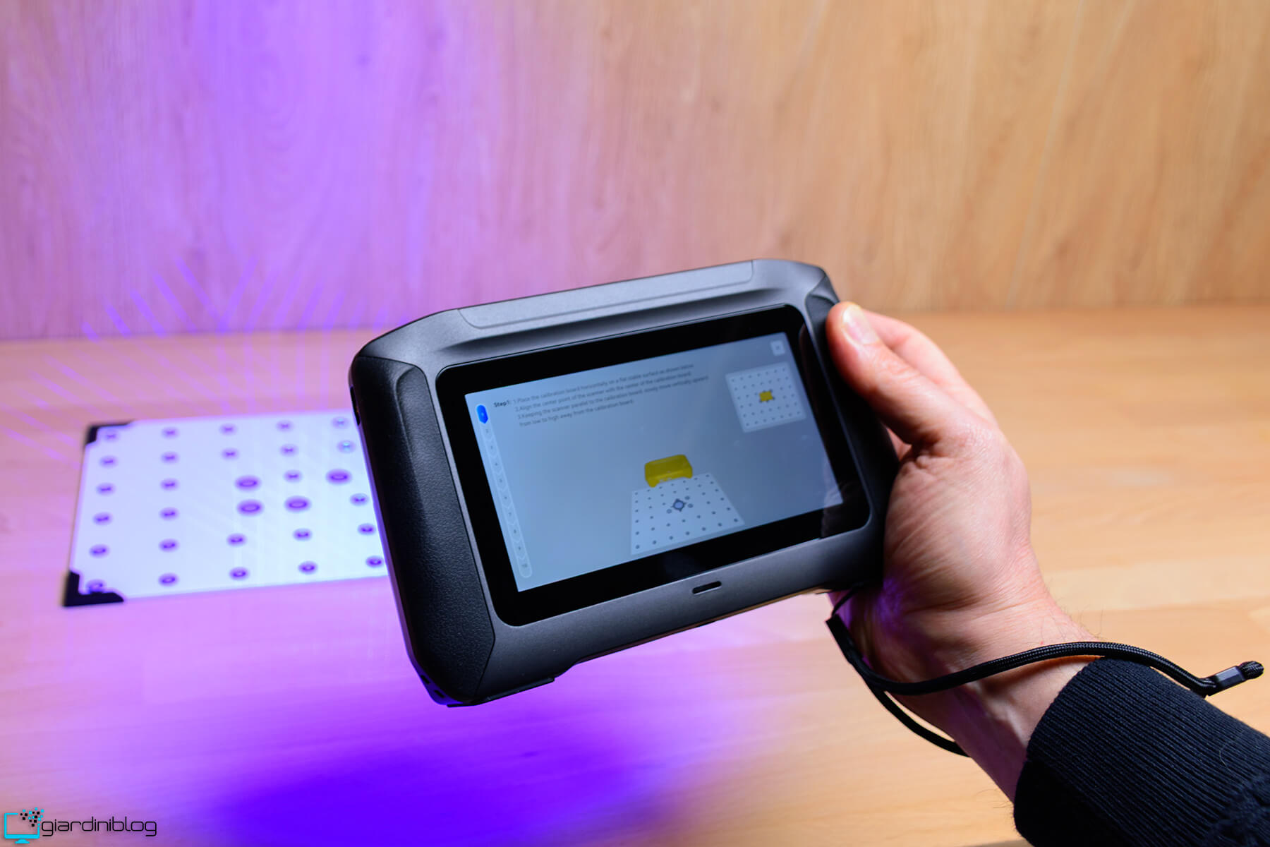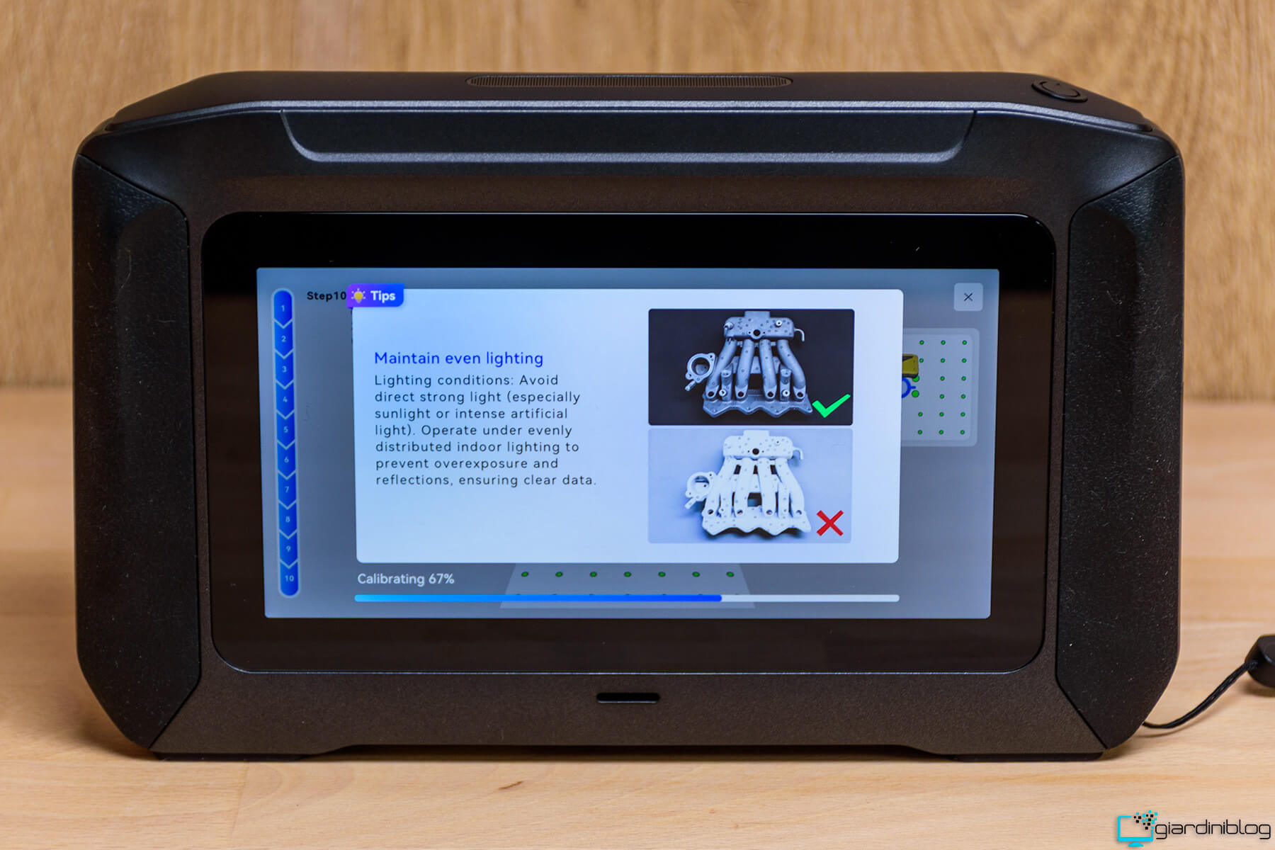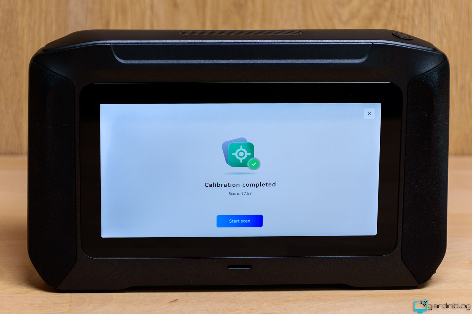La calibrazione è un passaggio essenziale prima dell’utilizzo dello scanner. Richiede alcuni minuti (circa dieci) ed è un’operazione da eseguire una sola volta, senza necessità di ripeterla prima di ogni scansione. Il processo avviene interamente in modalità standalone, direttamente sul dispositivo, utilizzando la piastra di calibrazione in vetro inclusa.