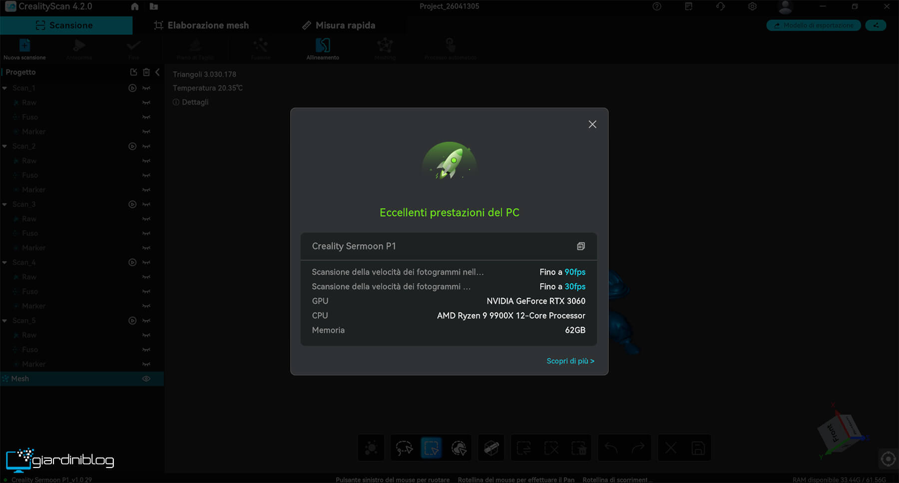 Dal punto di vista della velocità, il Sermoon P1 si distingue nettamente in modalità laser, in particolare con il sistema a 22 linee incrociate, progettato per la cattura rapida di superfici ampie. In questo scenario, il dispositivo può operare fino a circa 50–60 FPS in completa autonomia, con picchi ancora più elevati quando collegato a un computer, consentendo una acquisizione estremamente fluida e continua della geometria. Questo si traduce in una sensazione operativa molto reattiva: la mesh “si costruisce” quasi in tempo reale, riducendo drasticamente i tempi di scansione iniziale.