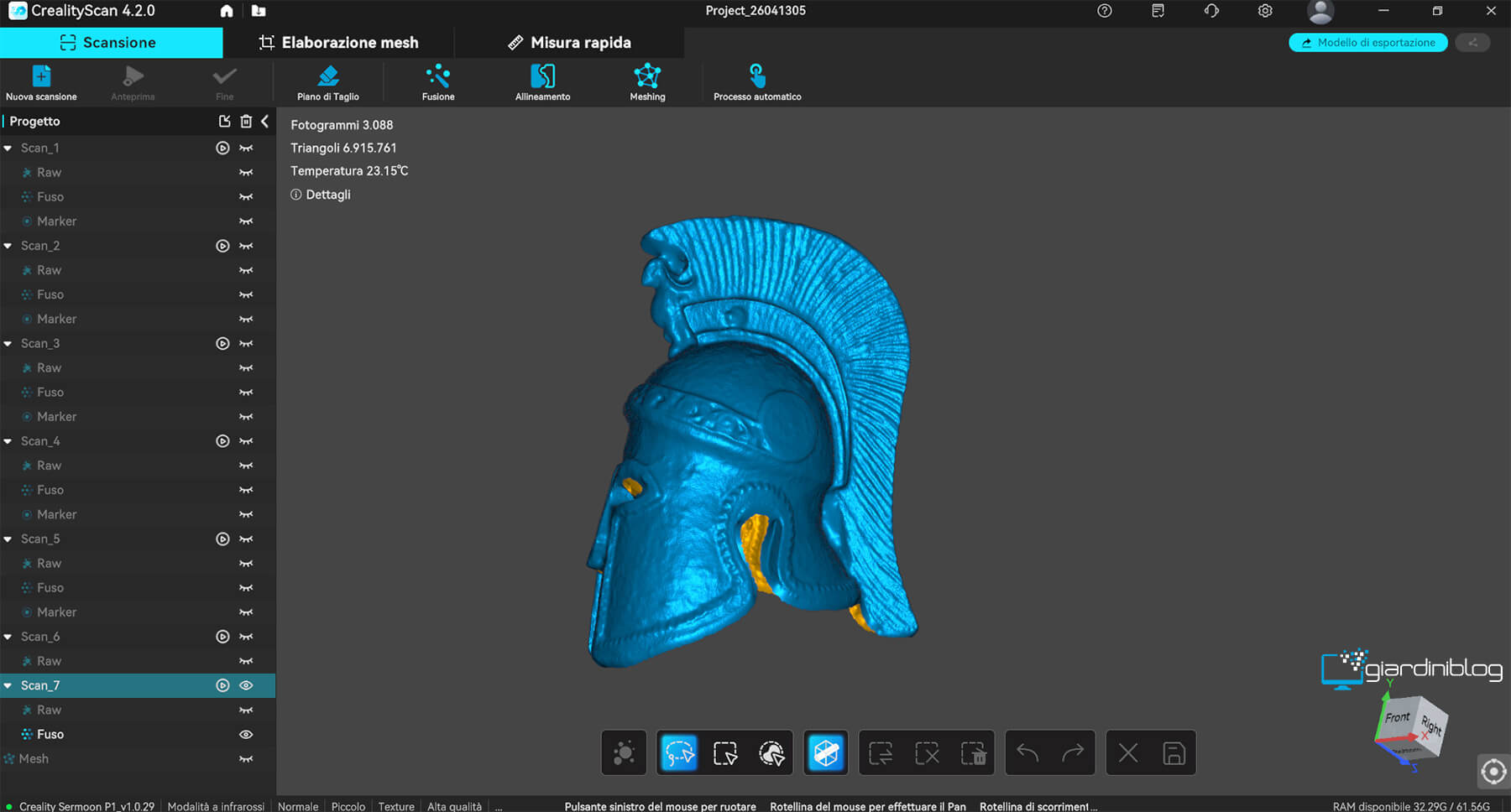 Nel dettaglio, il flusso operativo è strutturato in modo lineare e coerente: si parte dalla acquisizione dei dati di scansione, che avviene in tempo reale con visualizzazione immediata sul display, prosegue con la fusione della nuvola di punti, passa alla generazione della mesh e si conclude con la creazione delle texture e l’esportazione del modello nei formati standard (OBJ, STL, PLY).