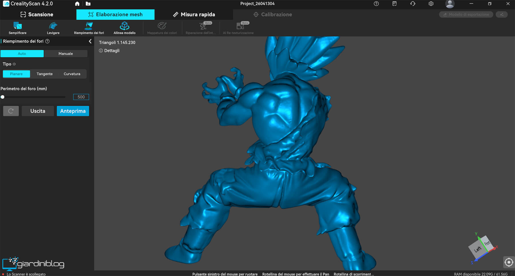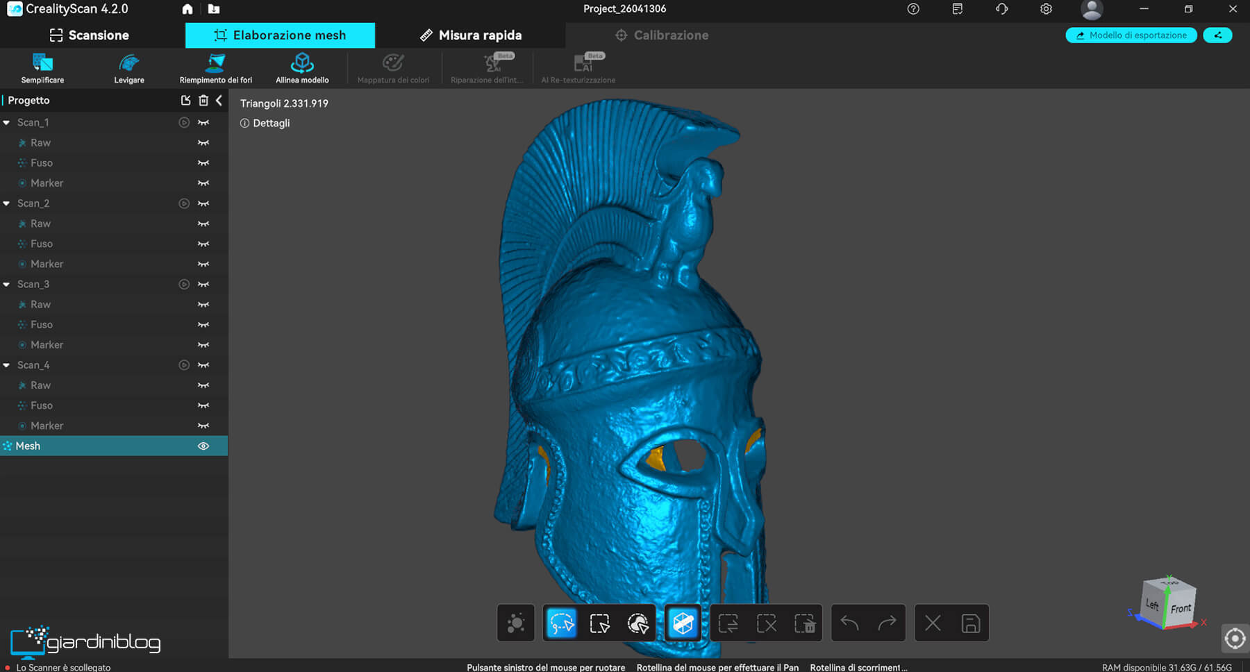 La qualità della mesh risultante è molto pulita, con buona continuità delle superfici e una gestione efficace di fori e imperfezioni grazie agli strumenti di post-processing integrati. Tuttavia, esiste una distinzione importante tra geometria e texture: mentre la prima è eccellente, la resa delle texture a colori risulta in sporadici casi meno convincente, con rari artefatti visibili.
