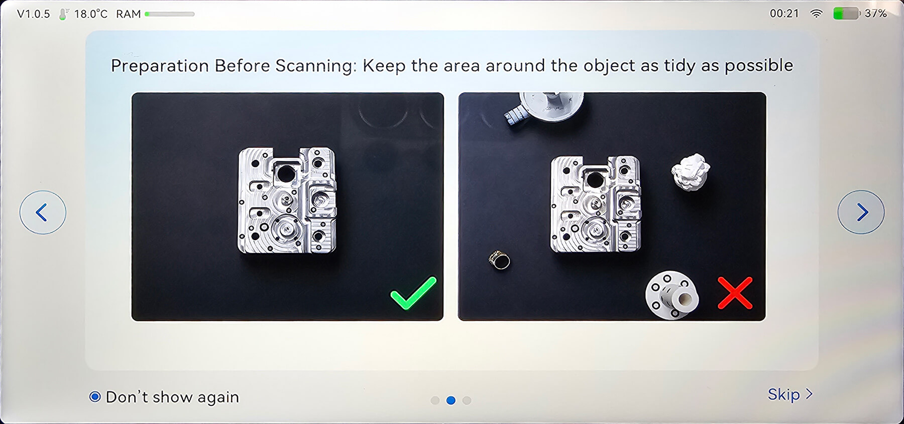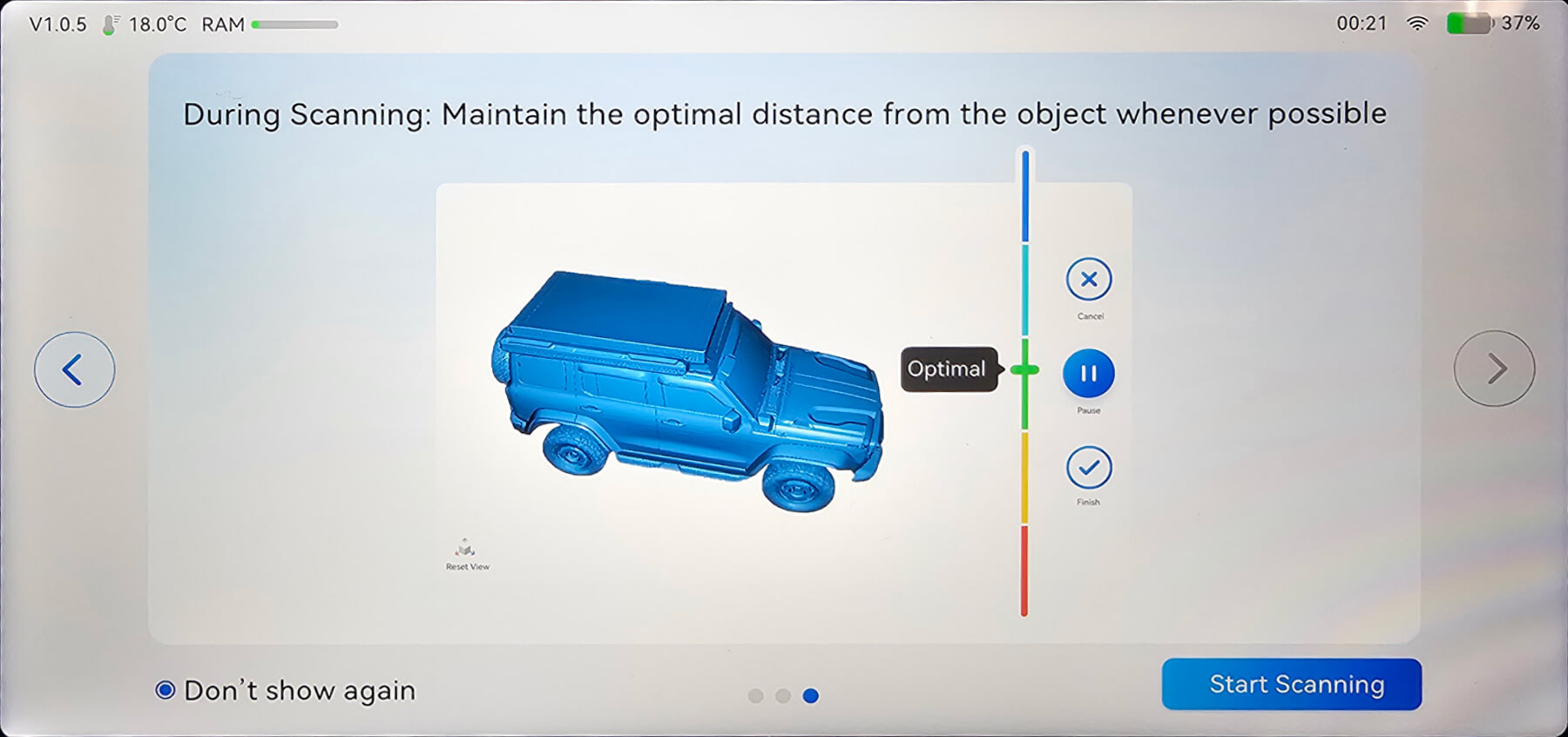 Al termine della procedura, il sistema fornisce un feedback visivo con un’indicazione di successo o errore e un punteggio numerico (espresso con tre cifre decimali) che consente di valutare la qualità della calibrazione ed eventualmente ripeterla per ottenere un risultato migliore. Una volta completata correttamente questa fase, lo scanner è pronto all’uso, continuando comunque a fornire suggerimenti e indicazioni durante le successive operazioni.