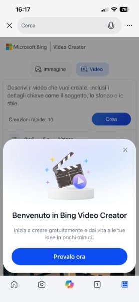 Ad accesso eseguito, seleziona l’icona in basso a destra raffigurata da un quadrato con dentro quattro pallini blu e pigia sullo strumento “Creatore di Video”. Pochi istanti dopo si aprirà l’interfaccia di Sora, con sullo schermo del dispositivo il messaggio “Benvenuto in Bing Video Creator”.