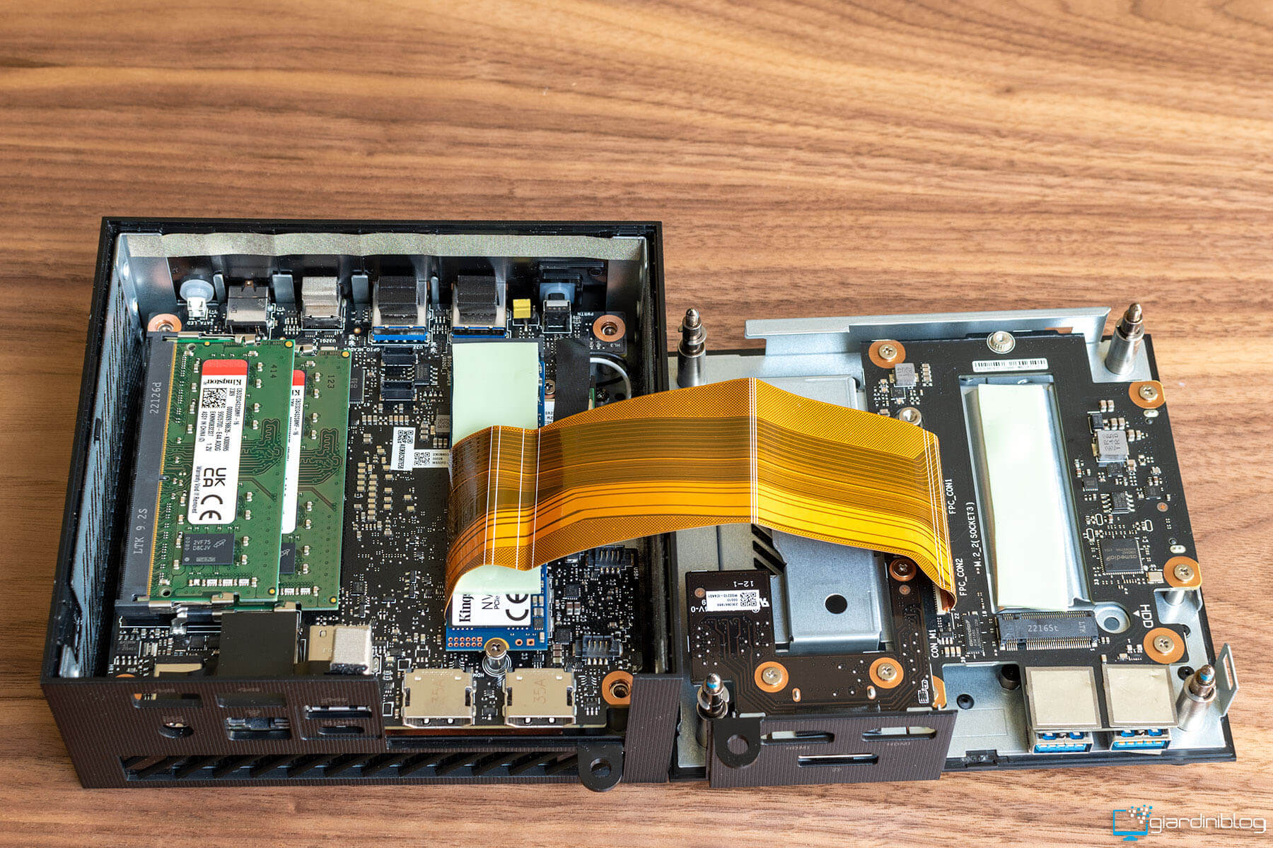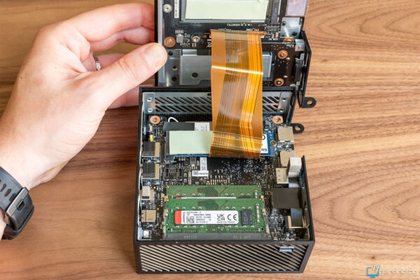 Gli slot del mini PC ospitano due moduli di memoria DDR5 Crucial CT16G48C4056 da 16 GB e un SSD Kingston PCle 4.0 da 1 TB dotato di un pad termico per favorire un’efficace dissipazione del calore e un modulo wireless.