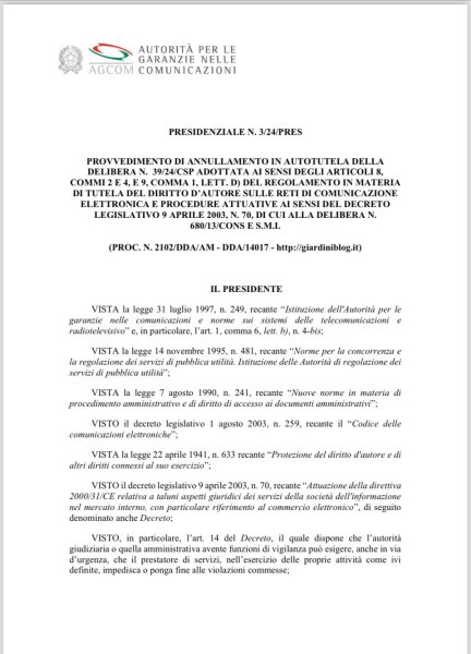 La redazione di GiardiniBlog esprime grande soddisfazione in seguito all’annullamento del provvedimento AGCOM (Autorità di Garanzia delle Comunicazioni) che aveva inibito l’accesso al sito stesso tramite blocco dei DNS.