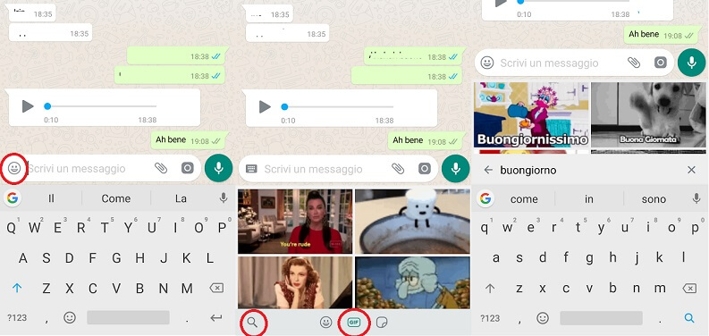 Sia su Android che su iOS non serve installare alcuna app per trovare facilmente le GIF animate da inviare; è sufficiente sfruttare il comodo motore di ricerca integrato (che è Tenor sia su Android che su iOS). E’ molto interessante per mandare messaggi animati originali velocemente ai nostri contatti.