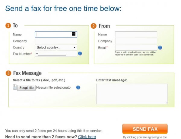 Se cerchi un servizio che ti permette di inviare fax online senza registrazione puoi provare MyFax. Con questo servizio ti basterà aprire il sito, digitare i dati del destinatario nel campo To, i dati del mittente in From, allegare il messaggio o il documento e cliccare in basso su Send FAX.