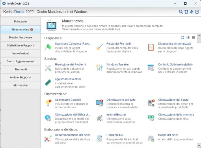 Nella sezione “Manutenzione” sono racchiuse le funzionalità più importanti del software. Tra queste ci sono la scansione completa del disco, l’eliminazione dei file inutili, la verifica degli ultimi aggiornamenti e l’ottimizzazione generale del computer.