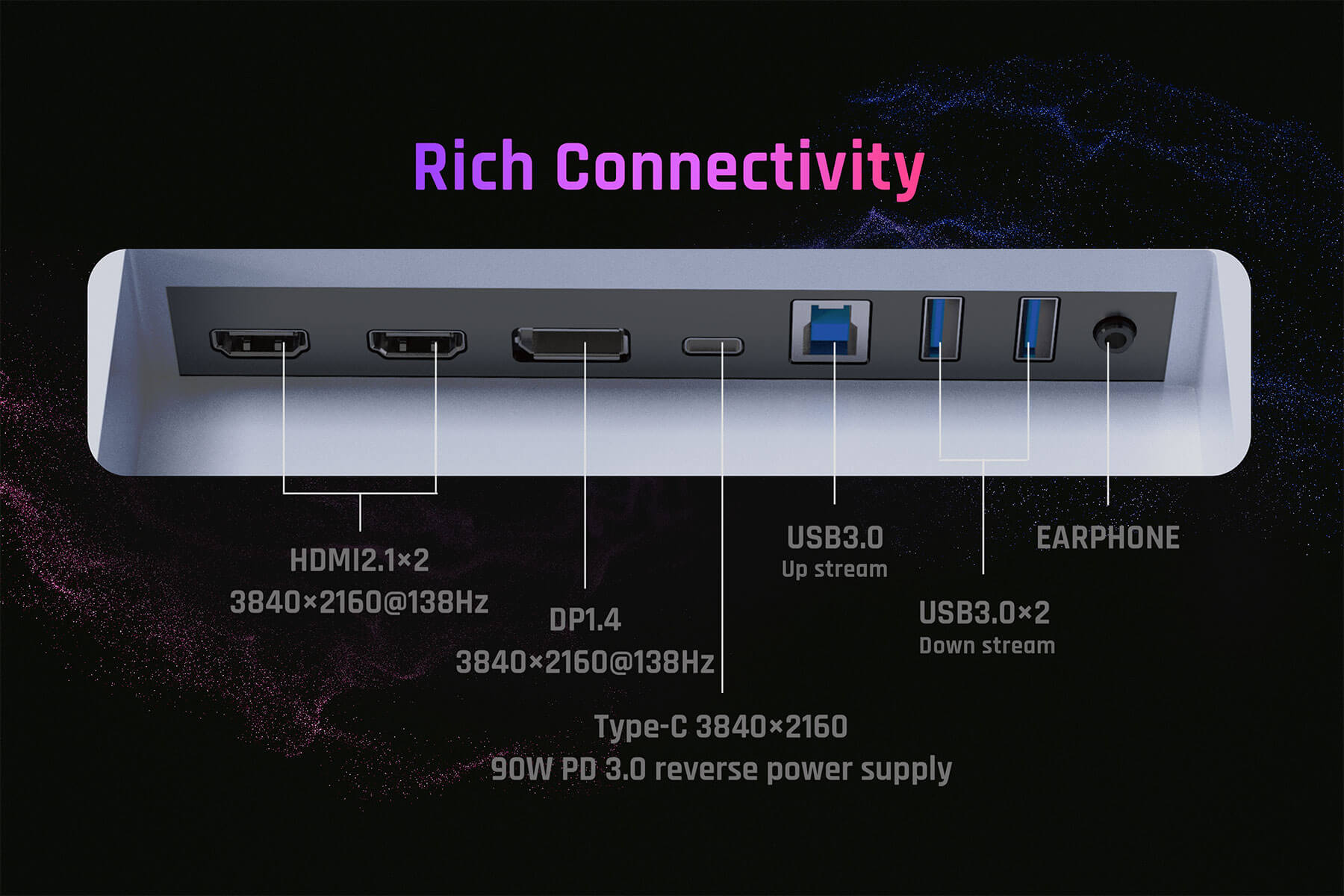 Un aspetto importante del KTC G42P5 è la sua connettività, dove troviamo vari ingressi video tra cui 2 porte HDMI 2.1 e una porta DisplayPort 1.4. Accanto ad essi troviamo inoltre una porta USB Type-C che consente la ricarica inversa fino a 90W, una porta USB-B 3.0 con cui gestire come hub le due porte USB 3.0 poste a fianco, e in fine un’uscita audio analogica per le cuffie tramite un Jack. Tutto il pannello è coperto a sua volta da un placca metallica con attacco magnetico estremamente comoda da mettere e togliere.