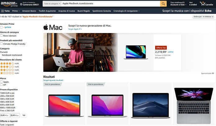 Ecco i migliori negozi online dove acquistare MacBook ricondizionati in modo sicuro e a buon prezzo. Della lista fanno parte marketplace molto noti, tra cui lo stesso Amazon, e altri meno. Quest’ultimi, nonostante non siano conosciuti dal grande pubblico, godono di un’ottima affidabilità e offrono in media 12 mesi di garanzia e fino a 30 giorni per richiedere il reso gratuito.