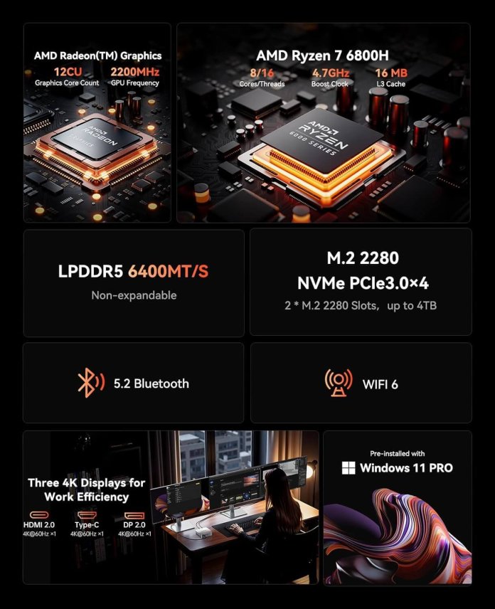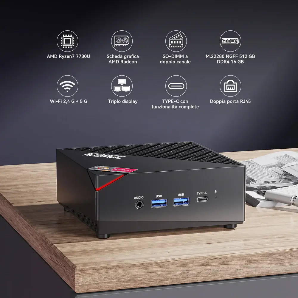 Per chi cerca un sistema bilanciato, l’ACEMAGIC AM06Pro rappresenta una soluzione estremamente interessante. Basato su processore AMD Ryzen 7 7730U, sempre accompagnato da 16GB di RAM e SSD da 512GB, questo modello punta su efficienza energetica e stabilità operativa. La serie Ryzen 7 7730U è particolarmente indicata per smart working, gestione documentale, piattaforme cloud, videoconferenze e utilizzo multimediale avanzato.