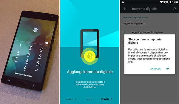 Il OnePlus Two presenta lo scanner di impronte digitali che una volta registrata la nostra impronta ci permette di sbloccare lo schermo tramite il tasto home. Il sensore di impronte è estremamente veloce e impiega meno di mezzo secondo a riconoscere la nostra impronta.