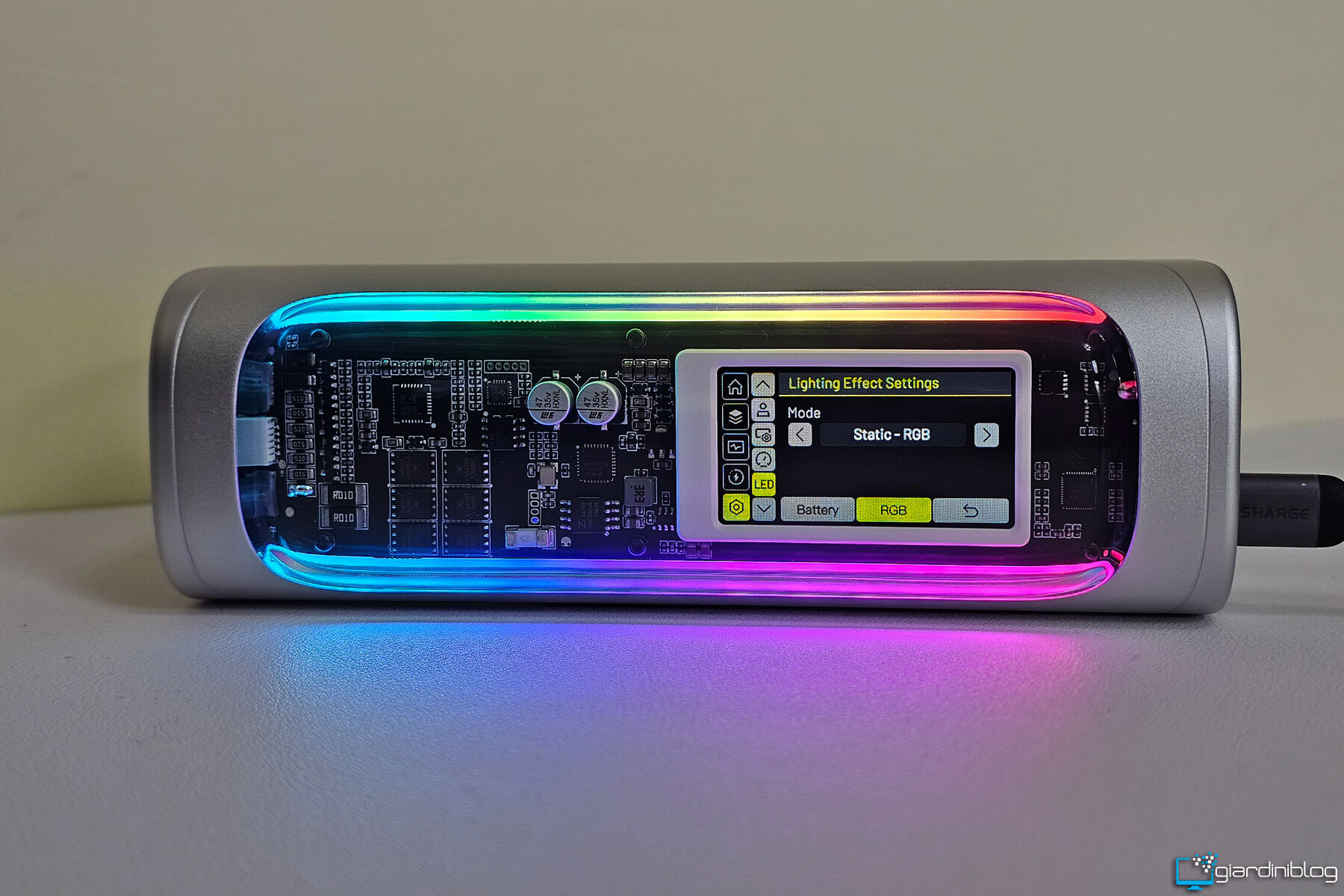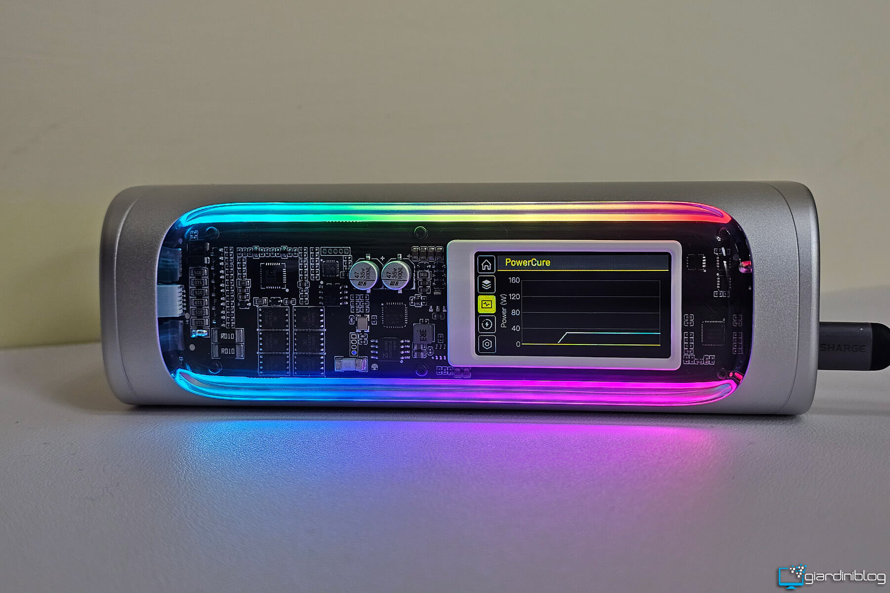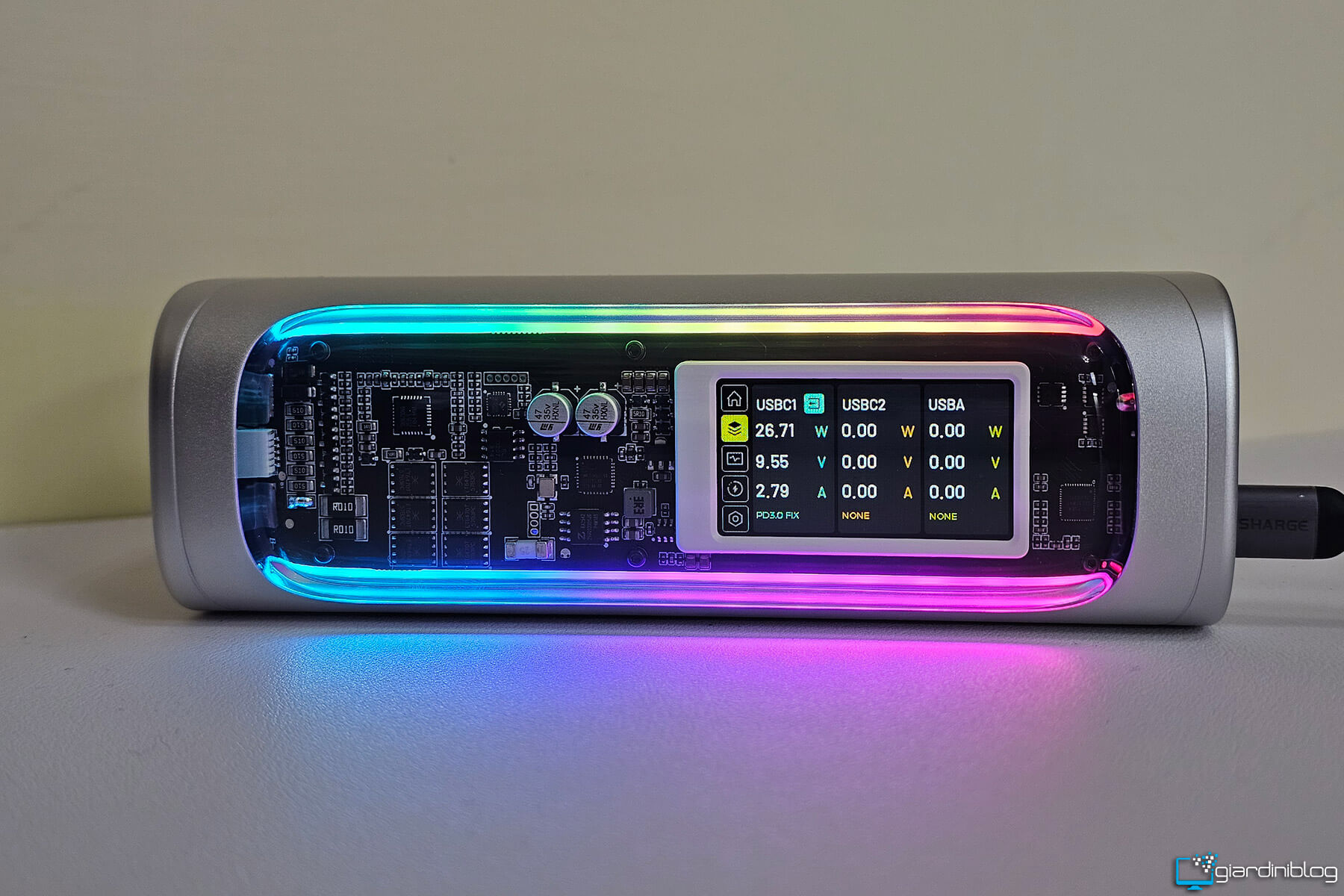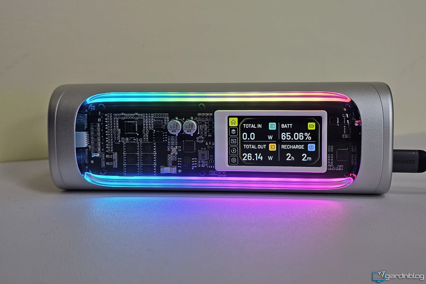 Il display non è un semplice vezzo estetico: sapere, ad esempio, che stai assorbendo 95 W dal tuo notebook o che il powerbank si sta ricaricando a 120 W fa una grande differenza per chi vuole controllo e precisione. L’illuminazione RGB presente è personalizzabile e aggiunge un tocco futuristico, forse superfluo per alcuni, ma coerente con un prodotto che vuole distinguersi anche visivamente.