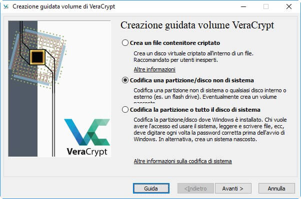 Clicca sul tasto “Crea un volume…” per iniziare la creazione dell’unità protetta. Nella prima schermata seleziona la seconda voce “Codifica una partizione/disco non di sistema” e clicca su “Avanti”.