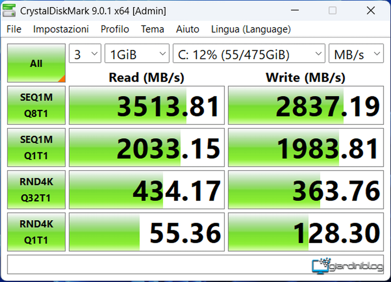 La velocità dell’SSD, come rilevato dai nostri test con CrystalDiskMark, si attesta a 3513 MB/s in lettura e 2837 MB/s in scrittura sequenziale. Si tratta di valori eccellenti che saturano quasi completamente l’interfaccia PCIe 3.0, garantendo tempi di avvio e caricamento software quasi istantanei. Anche la gestione dei file 4K casuali è buona (55 MB/s in lettura) aspetto che contribuisce alla fluidità durante l’uso normale con database o numerosi piccoli file.