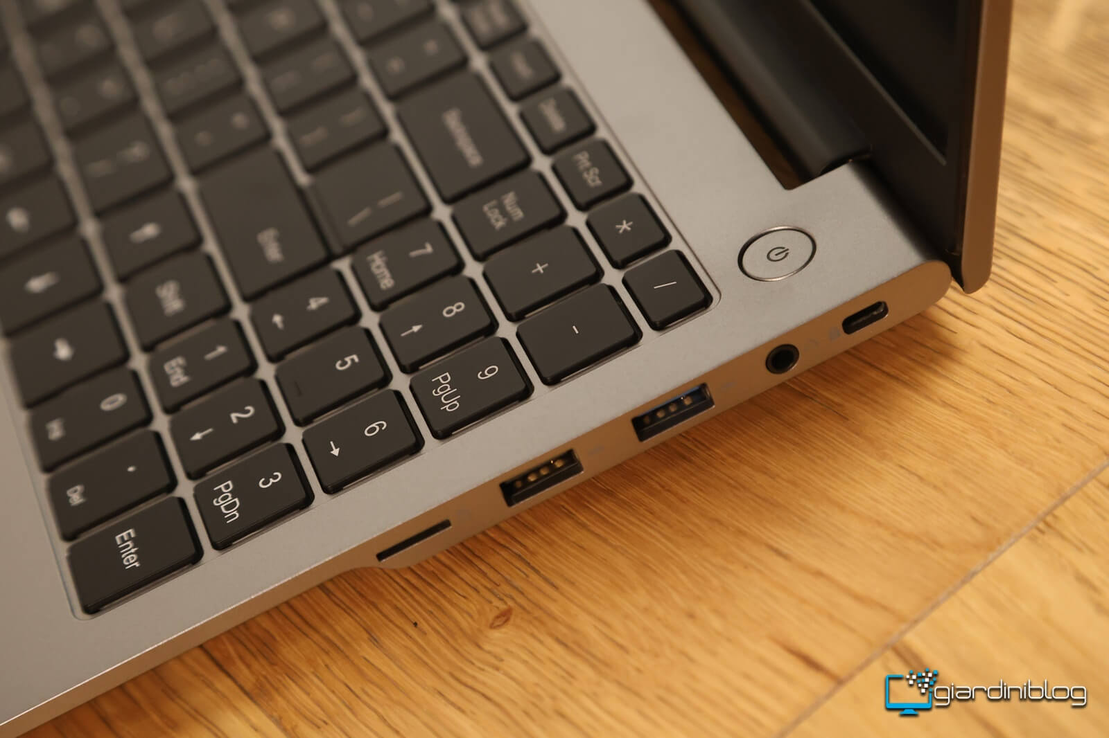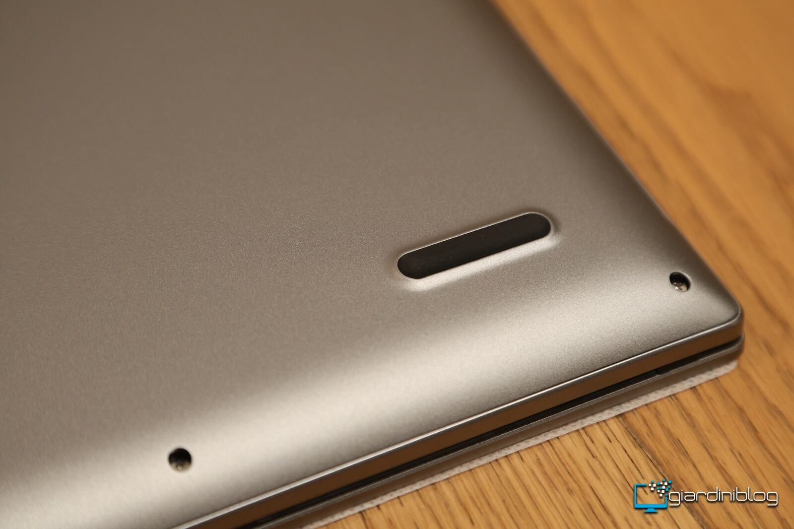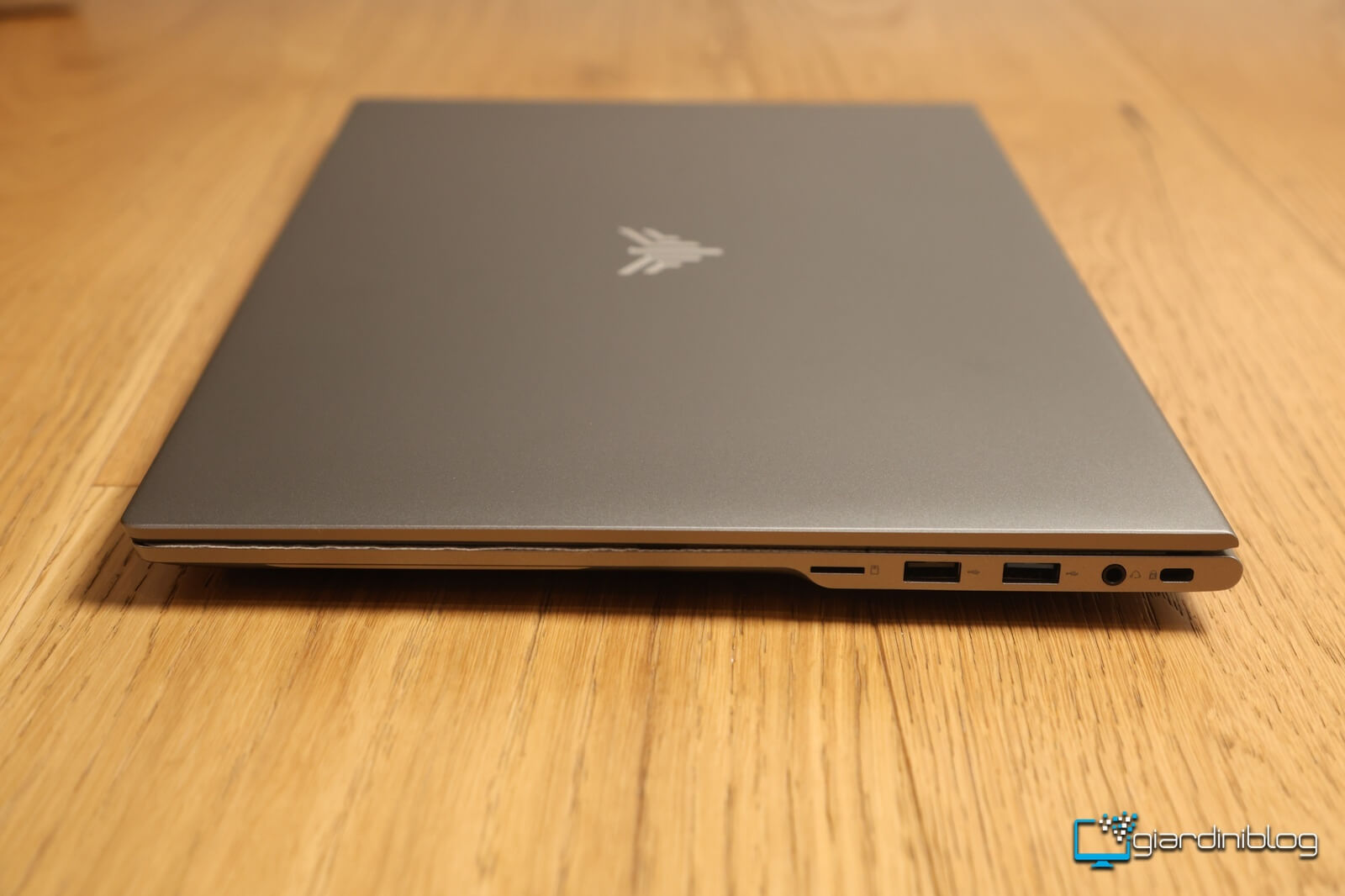 Entrando più in dettaglio e osservando il layout dei lati, vediamo che il profilo sinistro è stato pensato per garantire la massima connettività: qui troviamo il jack per l’alimentazione, una porta HDMI 2.0 per monitor esterni e due porte USB-C Full Function. Queste ultime supportano il trasferimento dati a 10 Gbps, l’uscita video DisplayPort e la ricarica rapida, permettendo di alimentare il laptop o collegare docking station avanzate con un solo cavo. Accanto, abbiamo una porta USB 3.2 Gen 2 Type-A completa un set di connessioni che elimina la necessità di hub esterni.