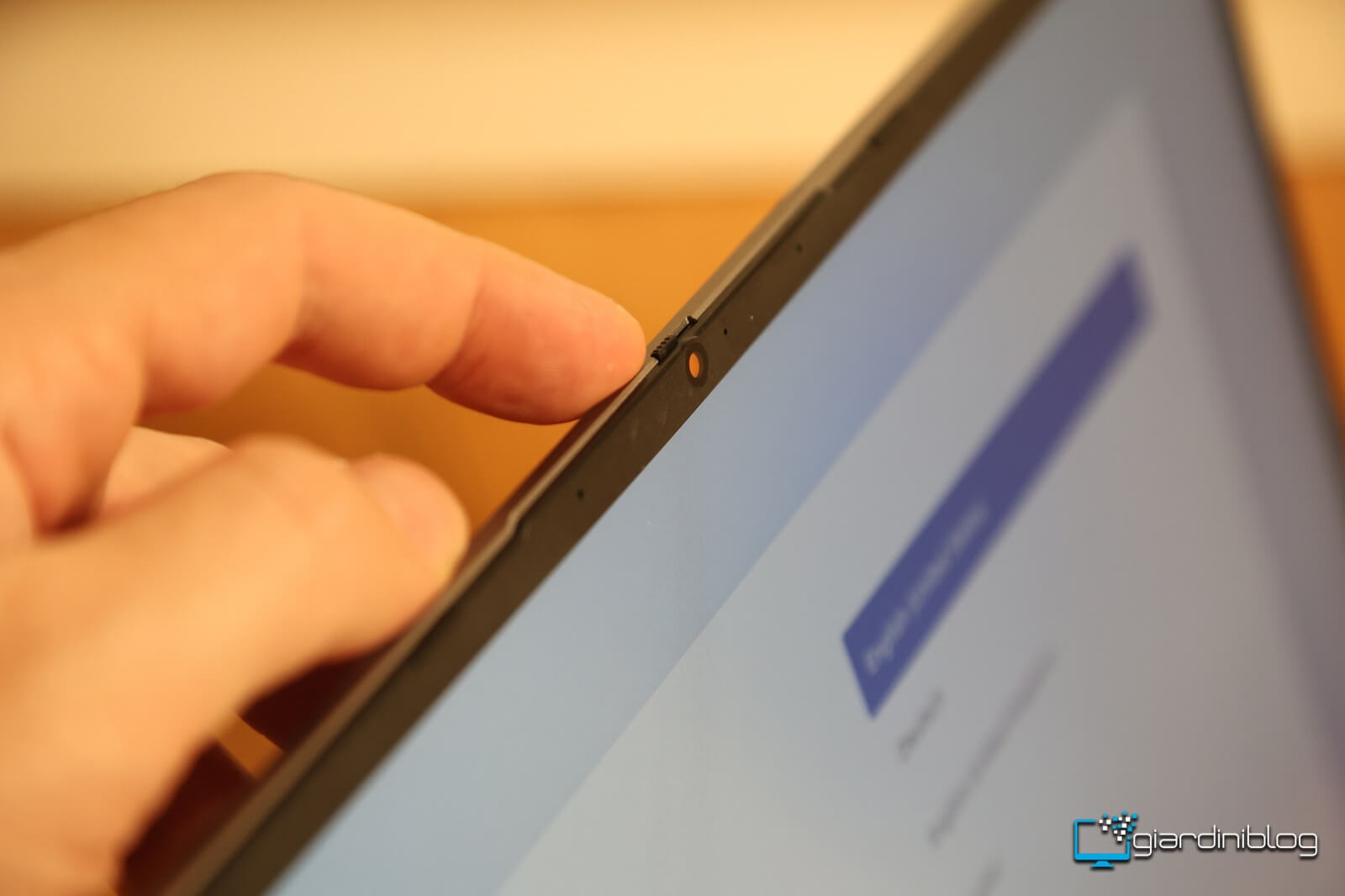 Di fianco sono posizionate una porta USB 3.2 extra, una USB 2.0 per periferiche legacy come mouse wireless, il jack audio da 3,5 mm e il punto di blocco Kensington per la sicurezza in ambienti pubblici. Sopra lo schermo, spicca la webcam dotata di un pratico otturatore fisico per la privacy, un dettaglio sempre più richiesto dagli utenti attenti alla sicurezza.