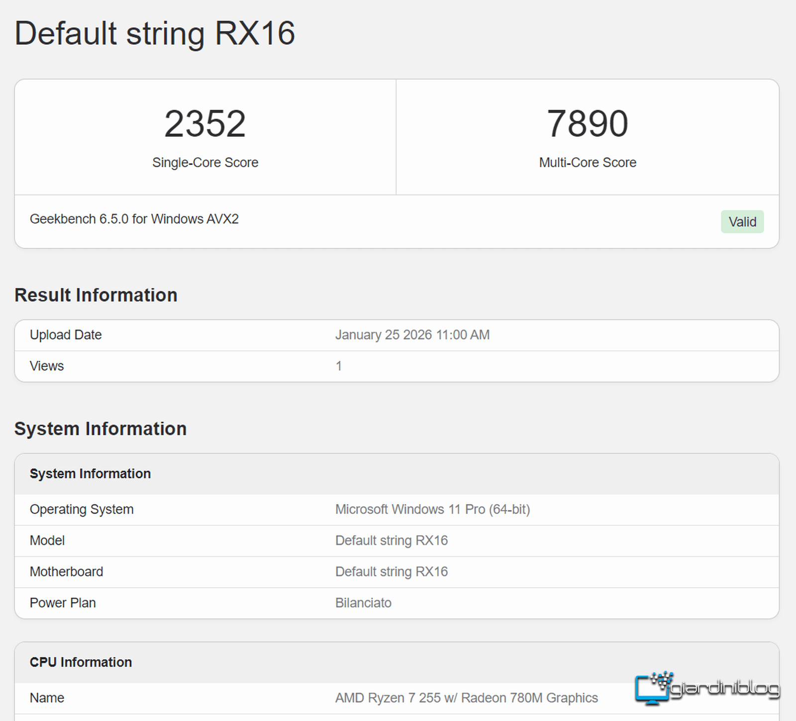 La CPU Ryzen H255 si difende egregiamente nei benchmark sintetici; su Geekbench 6.5.0 abbiamo ottenuto 2352 punti in Single-Core e 7890 punti in Multi-Core. Questi dati confermano l’ottima efficienza dell’architettura Zen 4 e posizionano l’RX16 come una macchina scattante nelle operazioni singole e molto capace nella gestione del multitasking spinto.