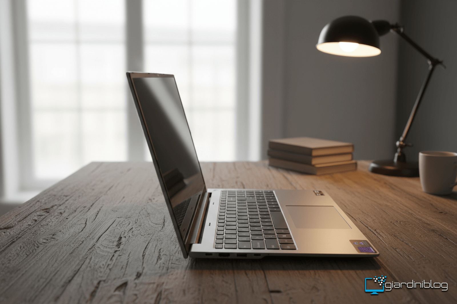 Il laptop si presenta con uno schermo generoso da 16 pollici e uno chassis robusto, caratteristiche che lo rendono una workstation mobile ideale per chi cerca un’area di lavoro ampia senza rinunciare alla trasportabilità necessaria per spostarsi tra casa e ufficio.