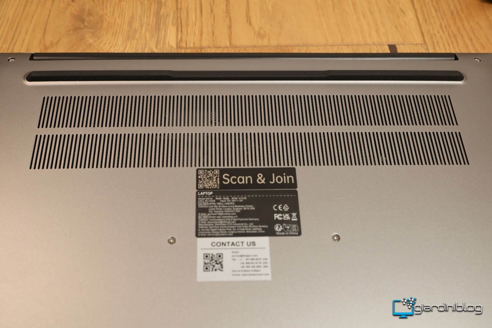 La base del dispositivo è stata progettata con piedini antiscivolo che assicurano un ancoraggio perfetto su qualsiasi superficie e un a, mentre le ampie griglie posteriori gestiscono il sistema a doppia dissipazione. L’accesso all’interno è facilitato dalla rimozione delle viti sulla base, permettendo upgrade rapidi a RAM e SSD, una caratteristica che garantisce longevità al sistema. Il design e la disposizione degli input dell’AceMagic RX16 rispecchiano una progettazione attenta che privilegia la produttività, offrendo un’esperienza d’uso solida e pensata per durare nel tempo.