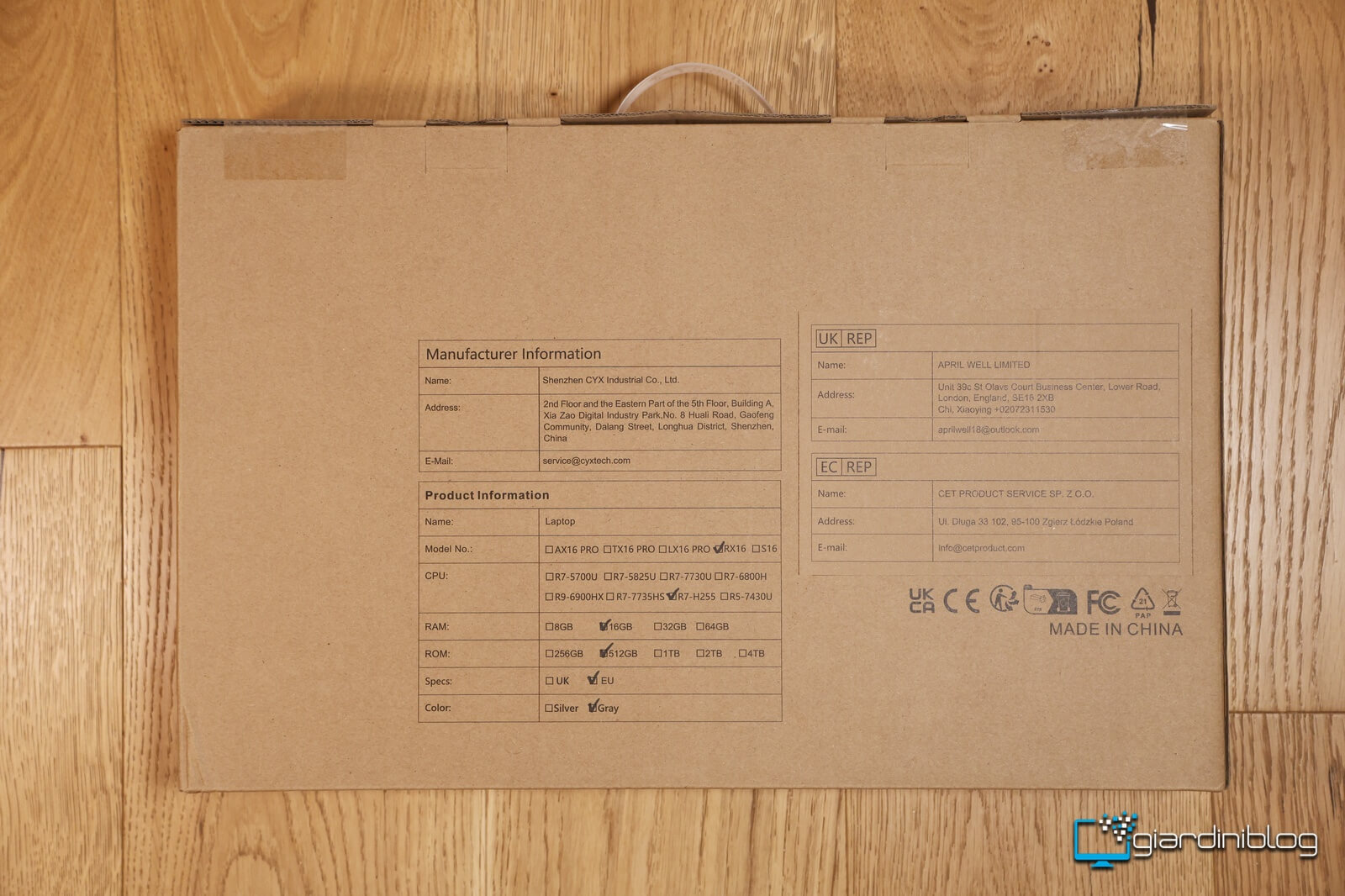 Il contenuto della scatola del Laptop AceMagic RX16 comprende: