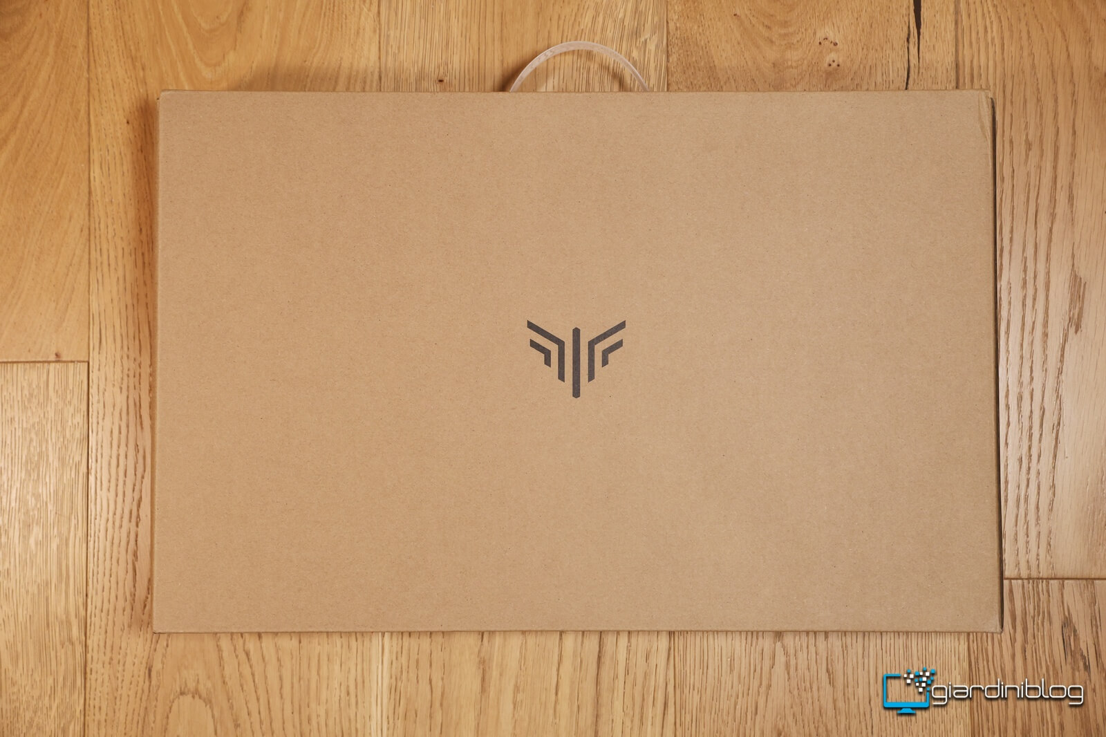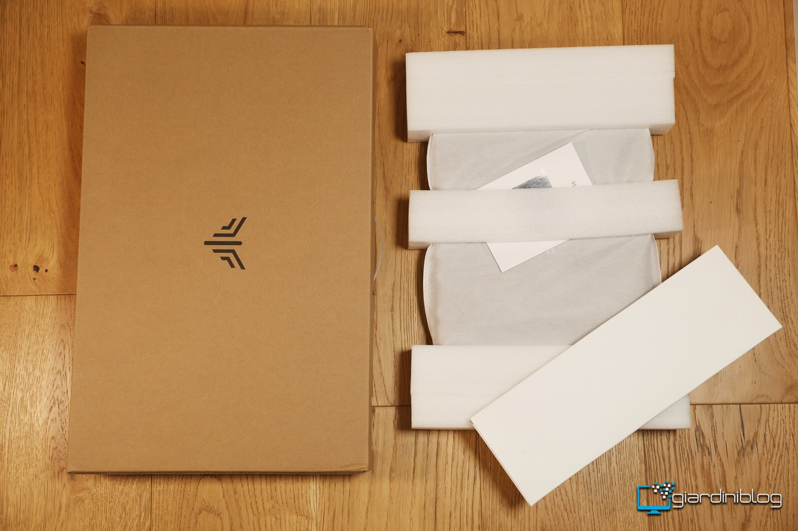 Aprendo la scatola ci troviamo davanti al laptop inserito saldamente in un guscio protettivo in schiuma ad alta densità e avvolto in una pellicola antistatica che garantisce una protezione totale durante il trasporto e crea un impatto visivo molto professionale. Sotto l’unità principale, i comparti dedicati ospitano gli accessori, organizzati in modo funzionale per trasmettere un senso di cura verso l’utente finale.