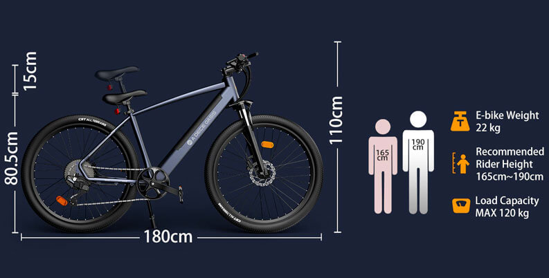 Le dimensioni di questa bici elettrica sono rispettivamente di 180 cm di lunghezza, per un’altezza da terra di 110 cm per il manubrio e un sellino la cui escursione varia da 80.5 a 95.5 cm di altezza dal suolo. La larghezza da un pedale all’altro, compreso il cavalletto è di circa 40 cm, mentre quella del manubrio è 64 cm.