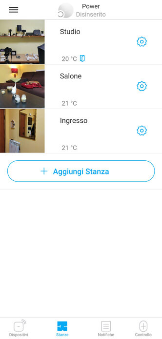 - Stanze – Qui possiamo vedere le stanze da noi configurate in cui abbiamo impostato i dispositivi e vedere per ogni stanza quali dispositivi sono presenti e configurarli;