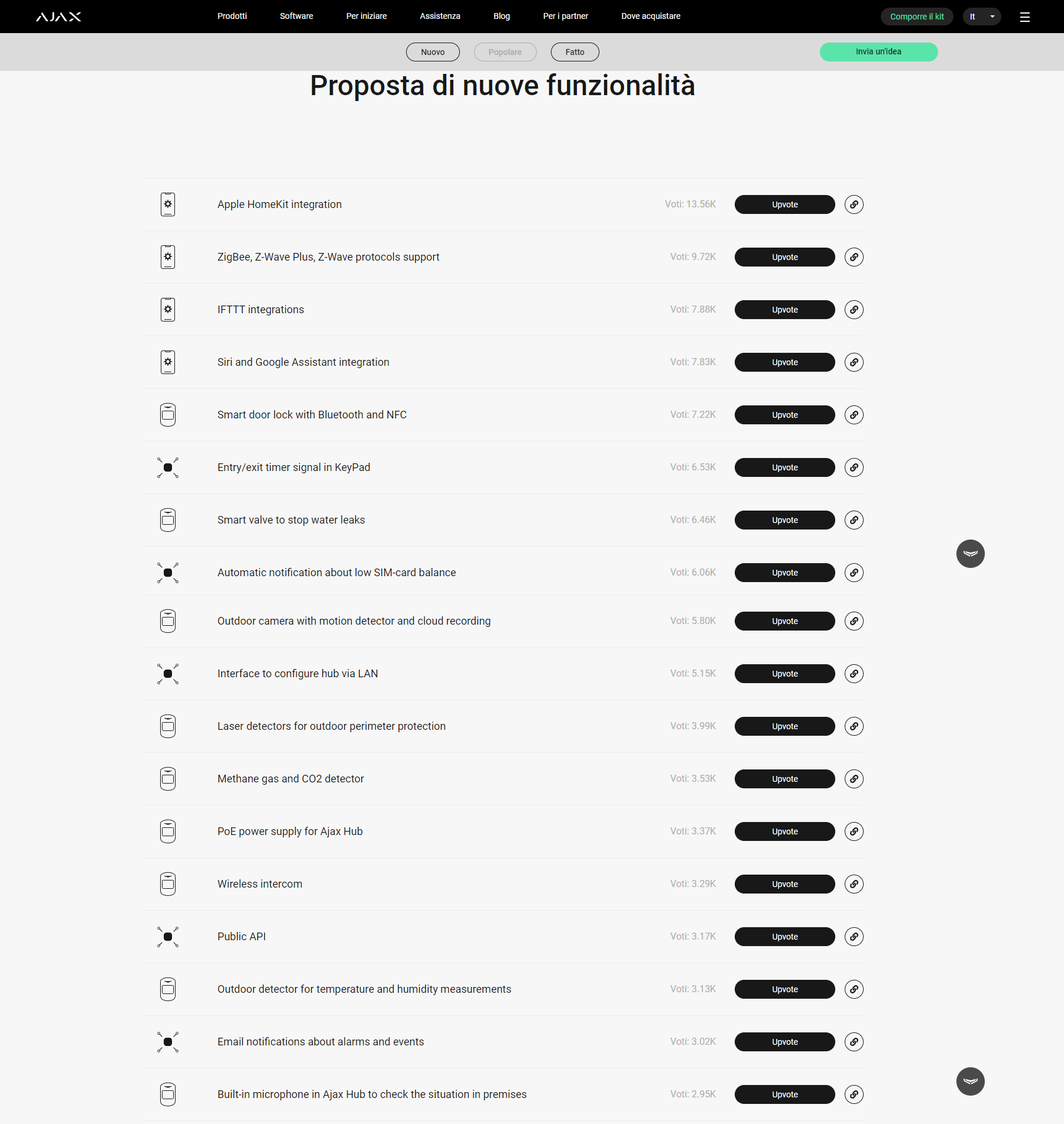 Ajax Systems è un’azienda che mira sempre a migliorare i propri prodotti, ascoltando attivamente i propri clienti. Ad esempio, sono presenti in questa pagina sul sito di Ajax Systems, alcune proposte che puoi votare, sulle funzionalità che vorresti vedere con i successivi aggiornamenti, o in alternativa puoi proporre una tua idea che vorresti vedere implementata in futuro.