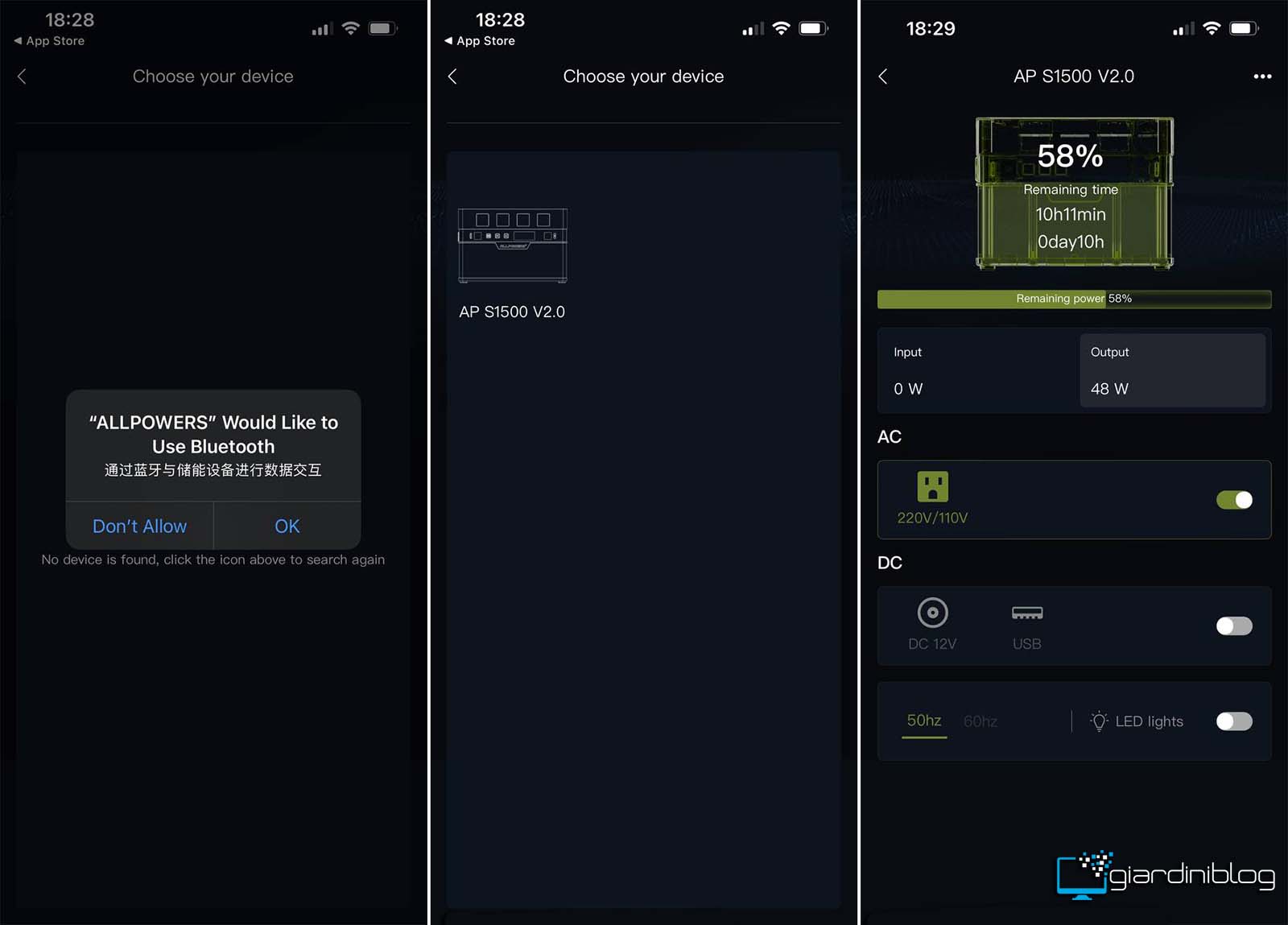 Una piacevole sorpresa è scoprire che è presente anche l’app per iPhone o Android di Allpowers, per connettersi da remoto alla power station S1500 e monitorarne lo stato. Sia chiaro, niente di rivoluzionario, ma in un contesto in cui siamo abiutati ad avere sotto controllo praticamente qualsiasi cosa tramite il nostro smartphone, è comunque una chicca di cui tener conto.