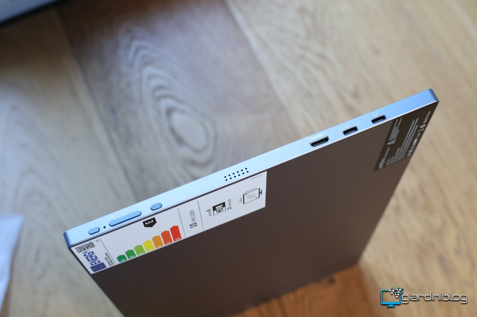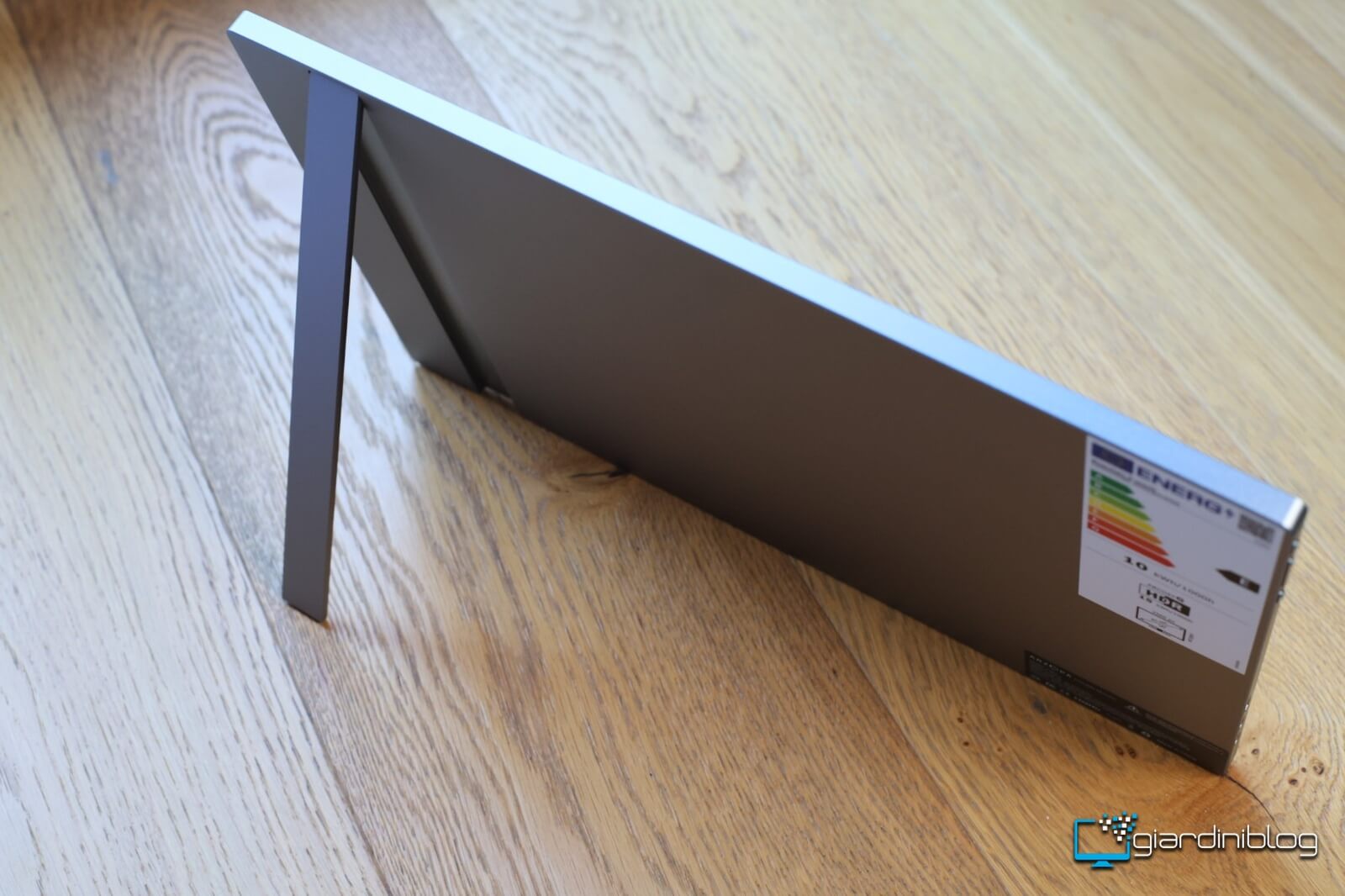 Sul retro è presente uno stand integrato che permette di regolare l’inclinazione del monitor secondo le proprie esigenze che può essere posizionato in orizzontale e anche in verticale. Il meccanismo di apertura è fluido e resistente ma è importante notare che la stabilità potrebbe non essere ottimale su superfici non perfettamente piane.