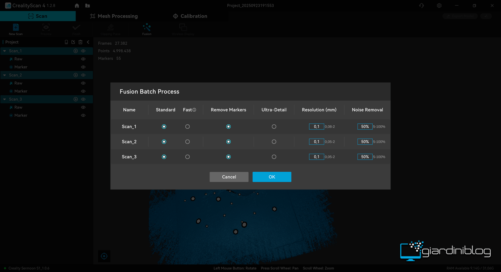Il workflow tipico del software Creality Scan 4 per effettuare una scansione 3D con Creality Sermoon S1 si articola in diverse fasi ben strutturate: