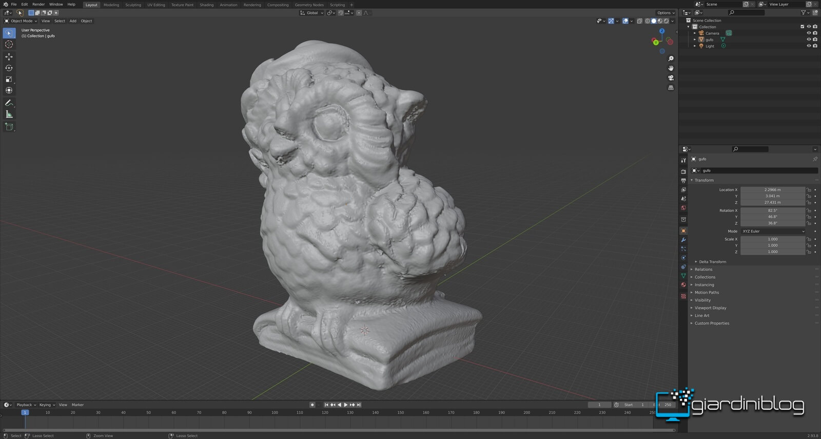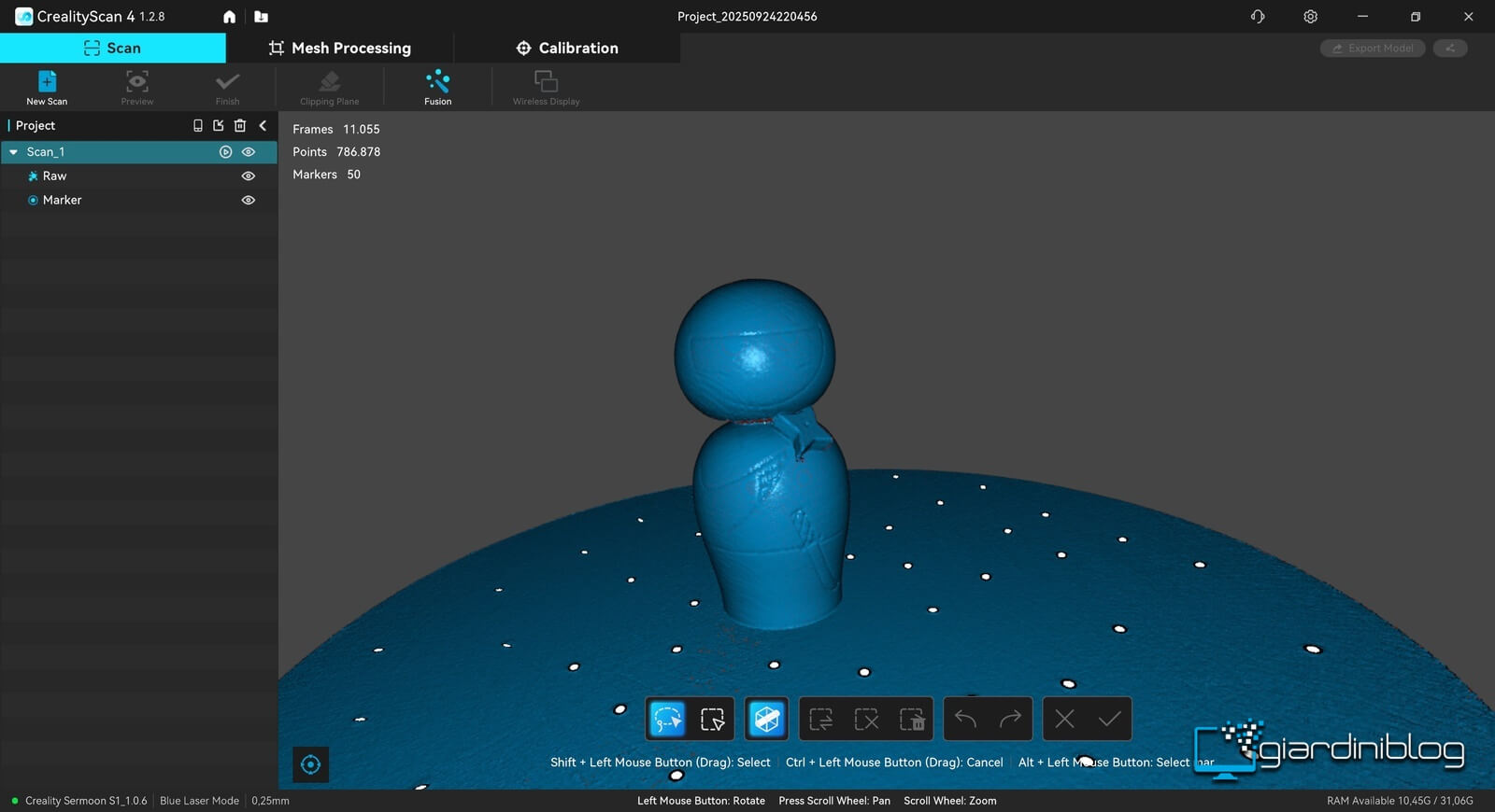La risoluzione impostata è di 0,3 mm, un valore giusto che serve a creare un compromesso tra dettagli ottenuti e tempi di acquisizione. CrealityScan 4 ci consente il controllo in tempo reale ed esclude la base di appoggio, limitando il rumore di fondo; non sempre in realtà questa opzione ha funzionato e spesso è necessario selezionare “clipping plane” e far passare un piano da 3 marker per rimuoverlo. Ancora una volta, posizionare l’oggetto sulla base rotante comunque si è rivelato essenziale e ha contribuito a facilitare le scansioni di molto. Dopo diverse acquisitizioni, il processo di allineamento ha completato le diverse inquadrature e il modello risultante è risultato molto soddisfacente e dettagliato. Il gufo appare con una struttura omogenea, privo di fori significativi e ricco di micro-dettagli, osservabili anche con software come Blender.