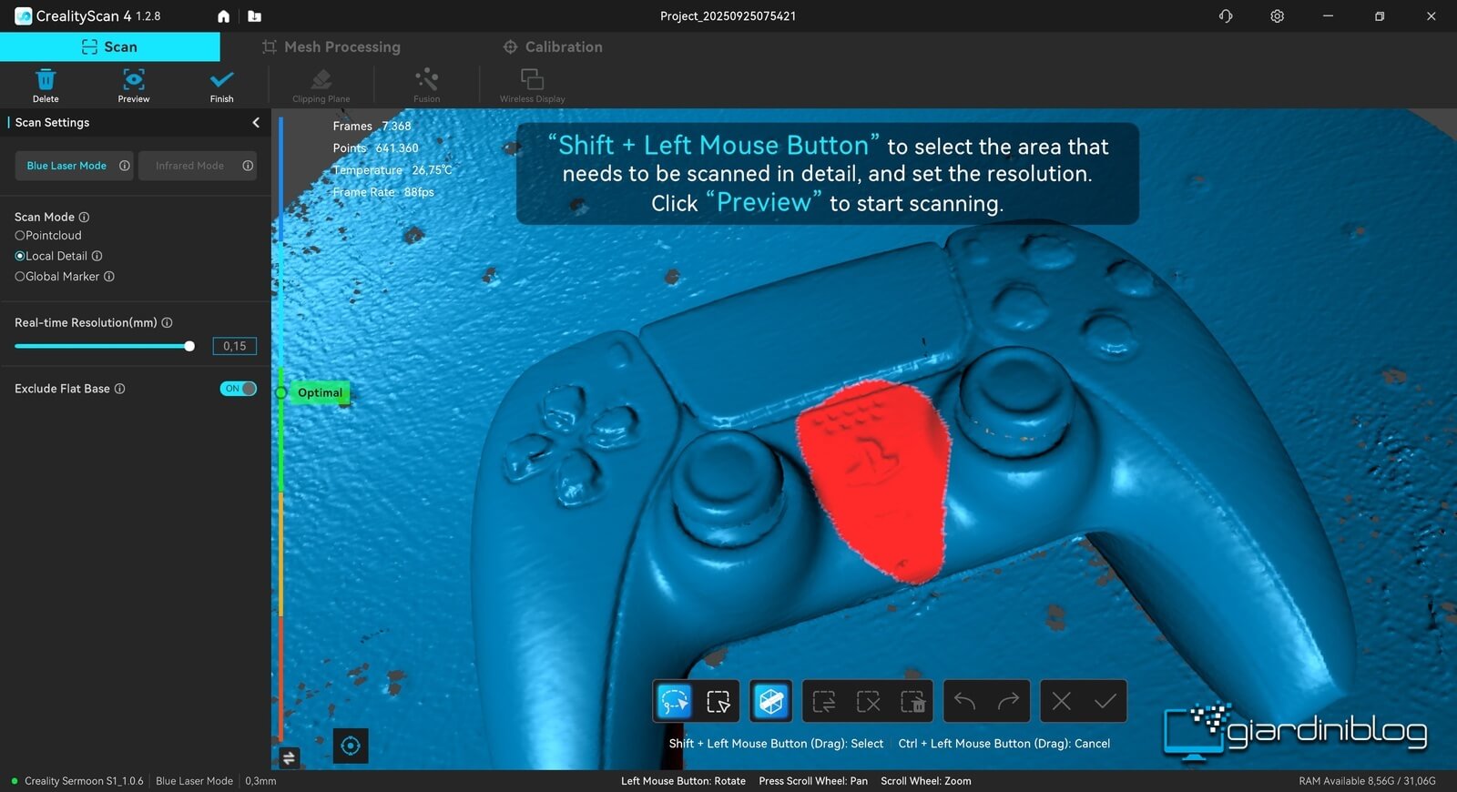 Dal punto di vista delle performance, il Creality Sermoon S1 offre grande flessibilità e precisione, permettendo di passare facilmente da scansioni rapide e generiche a sezioni molto dettagliate. Questa versatilità consente un controllo più accurato e risultati migliori, adattandosi perfettamente a diversi livelli di complessità nel processo di scansione.